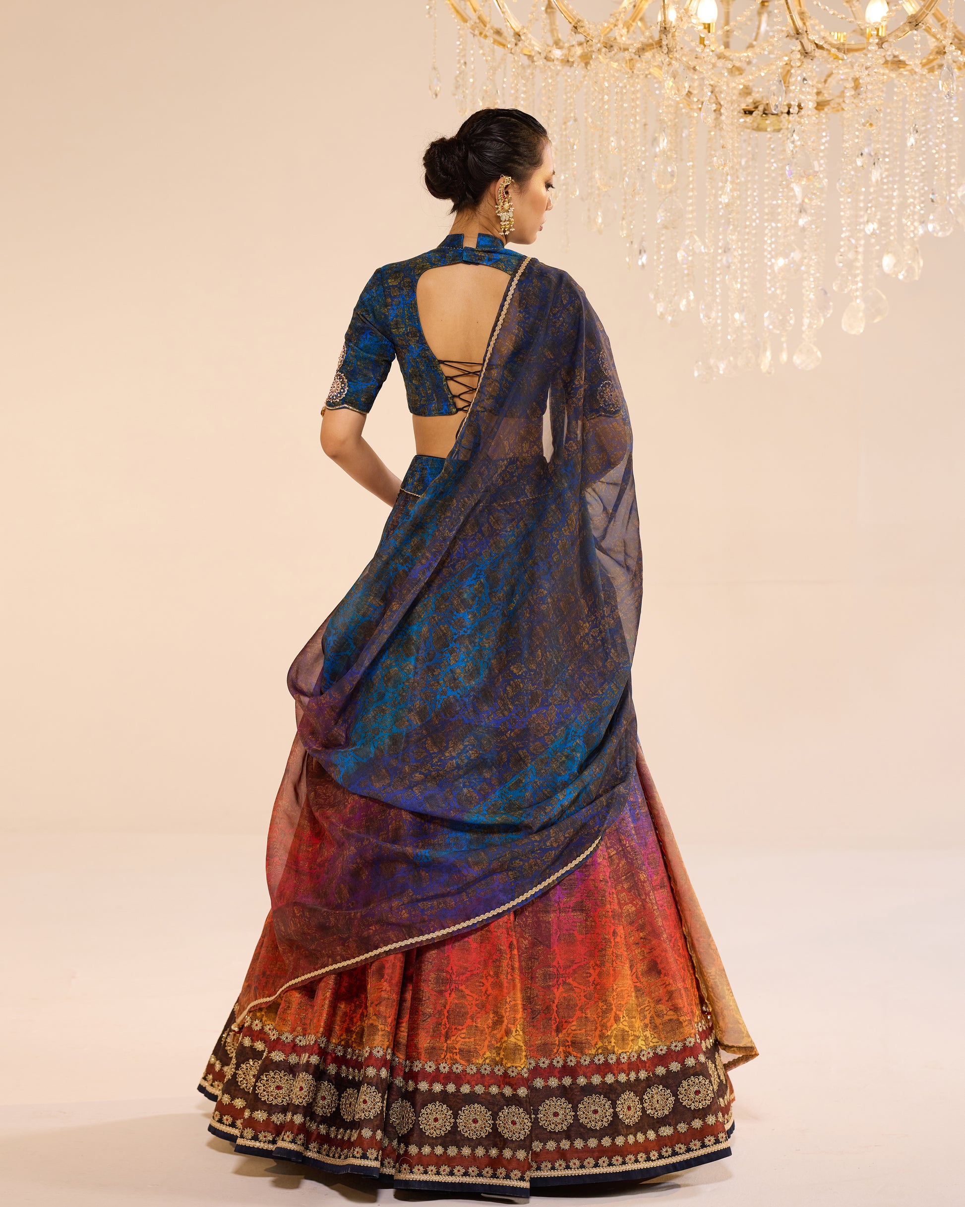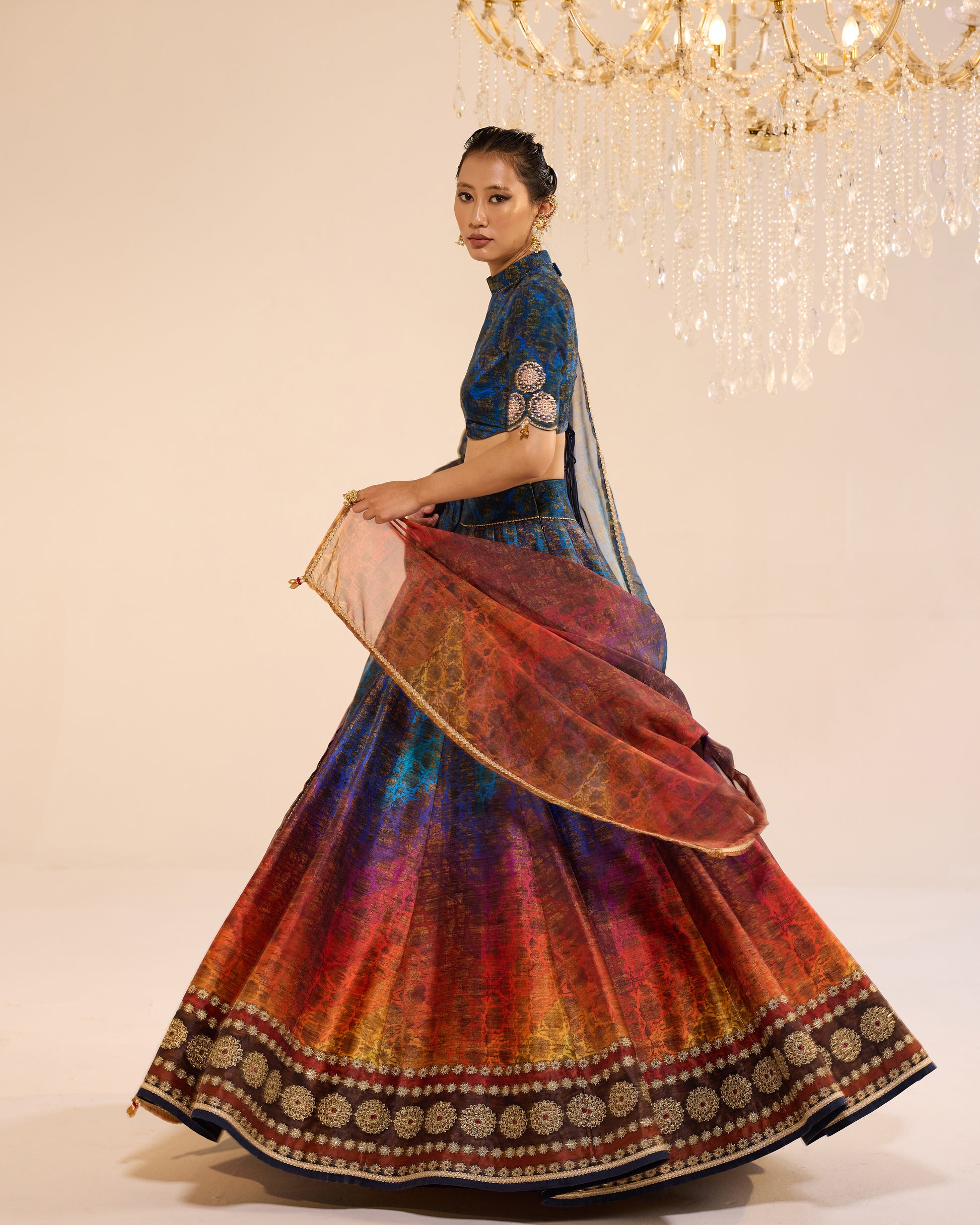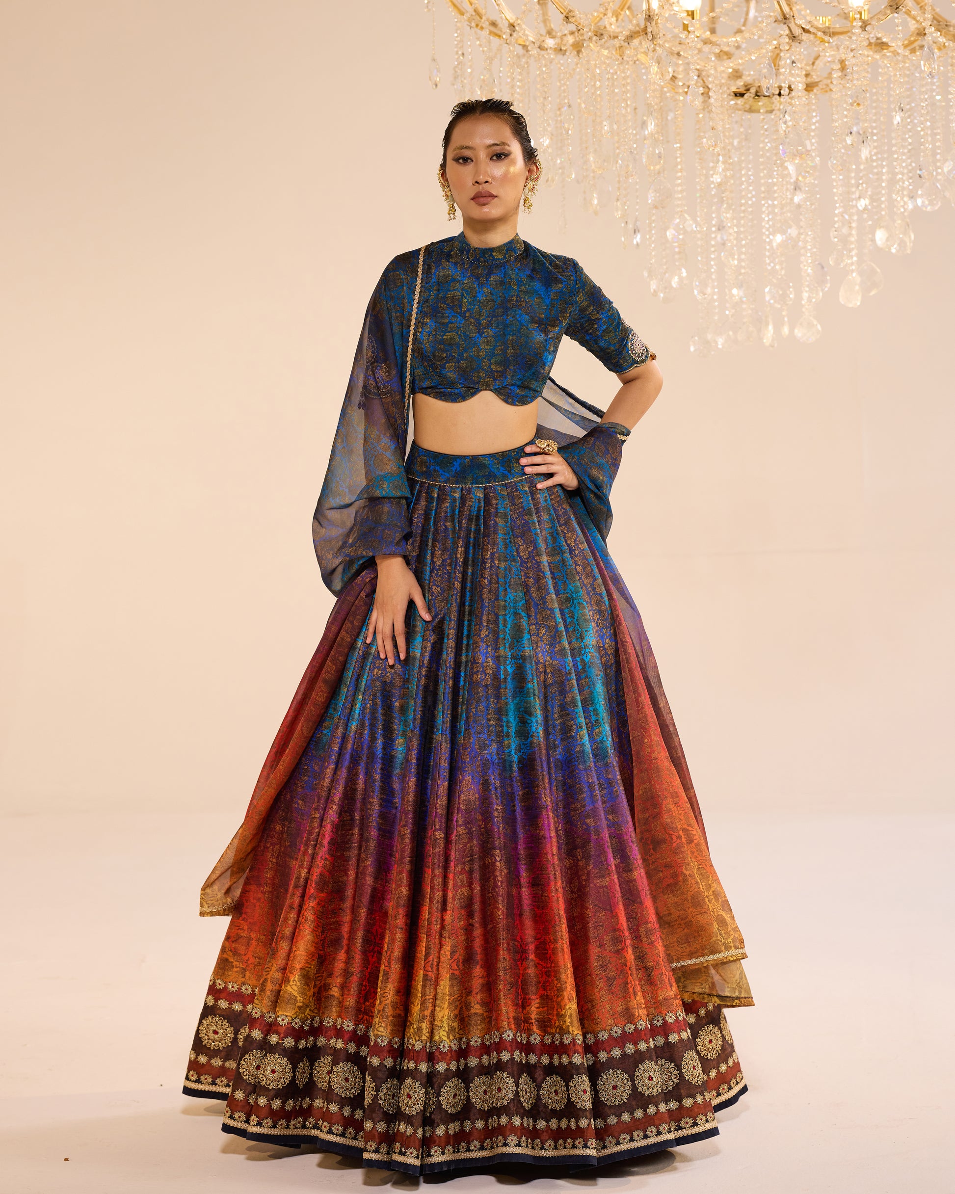 Sunset shade print lehenga with embroidered border. It is paired with printed velvet blouse and printed dupatta