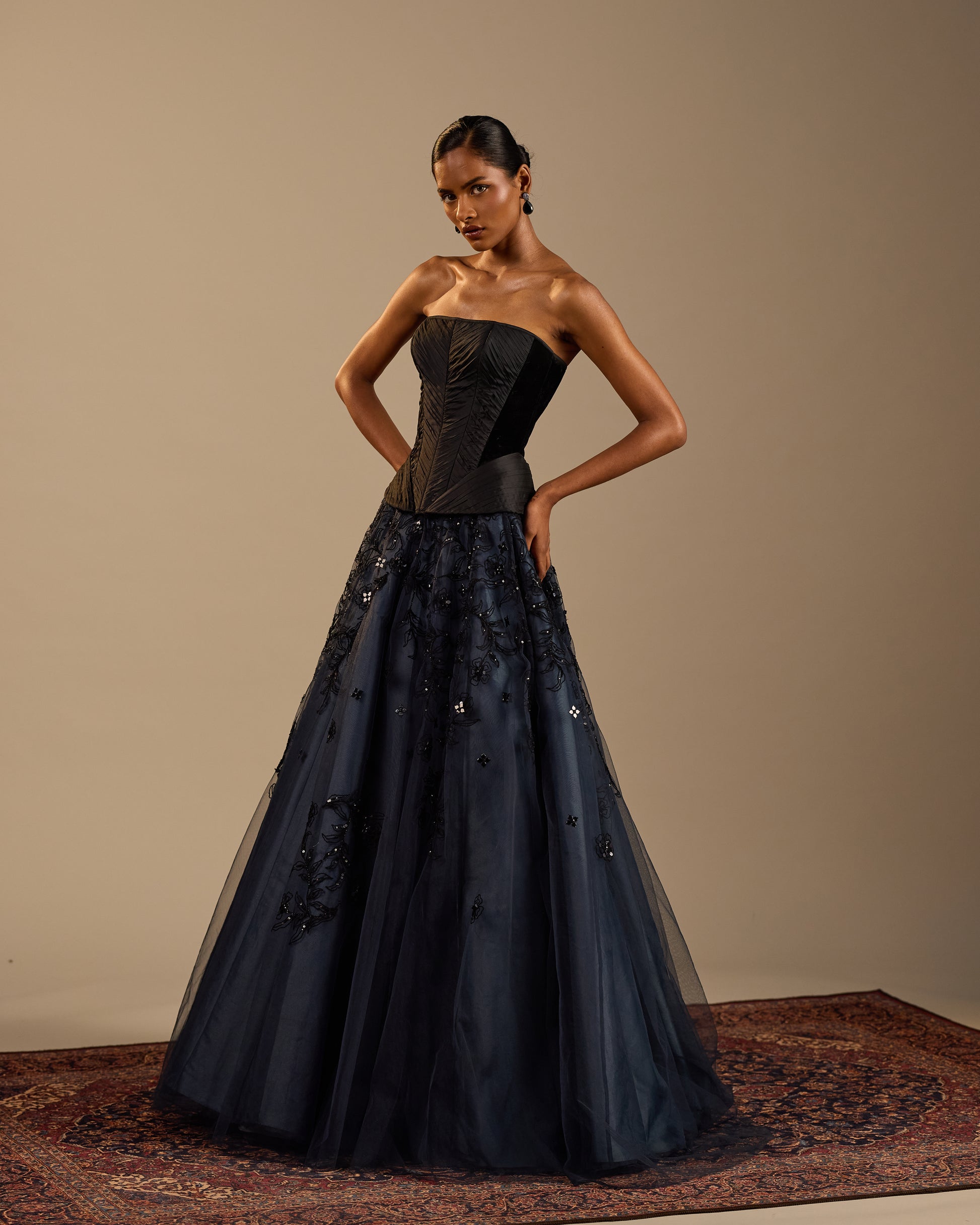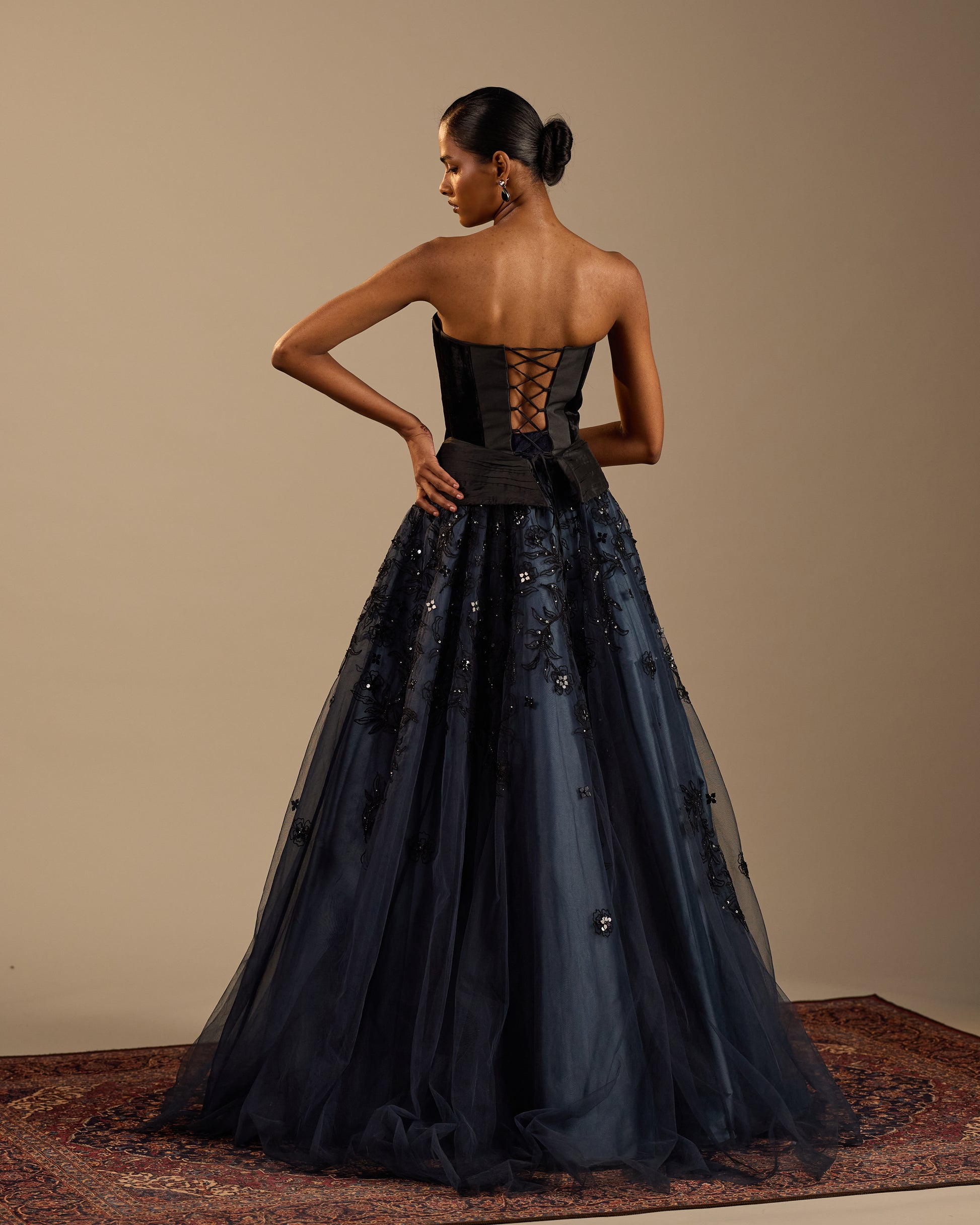 Black tulle skirt with floral embroidery. It is paired with black pleated long corset top.