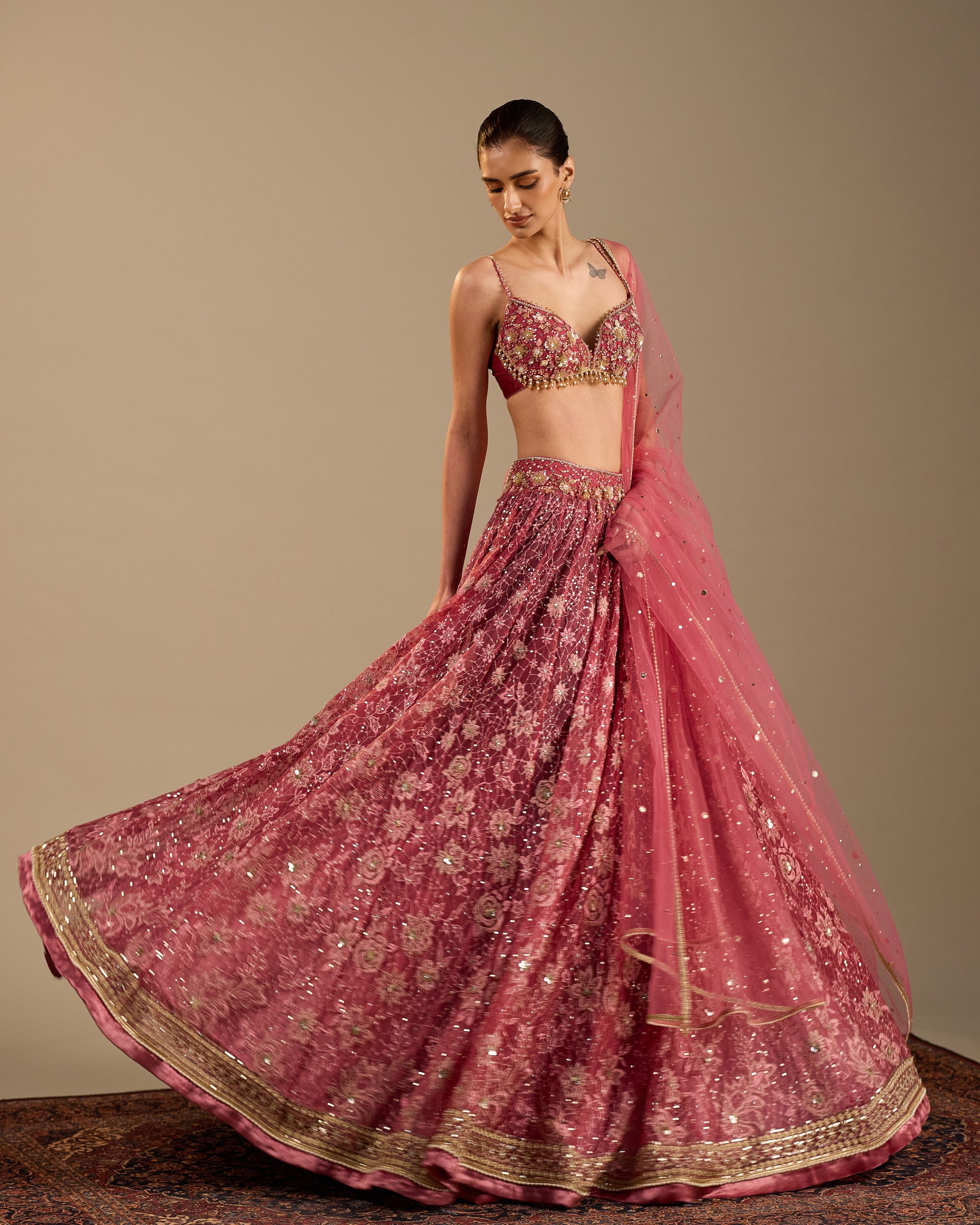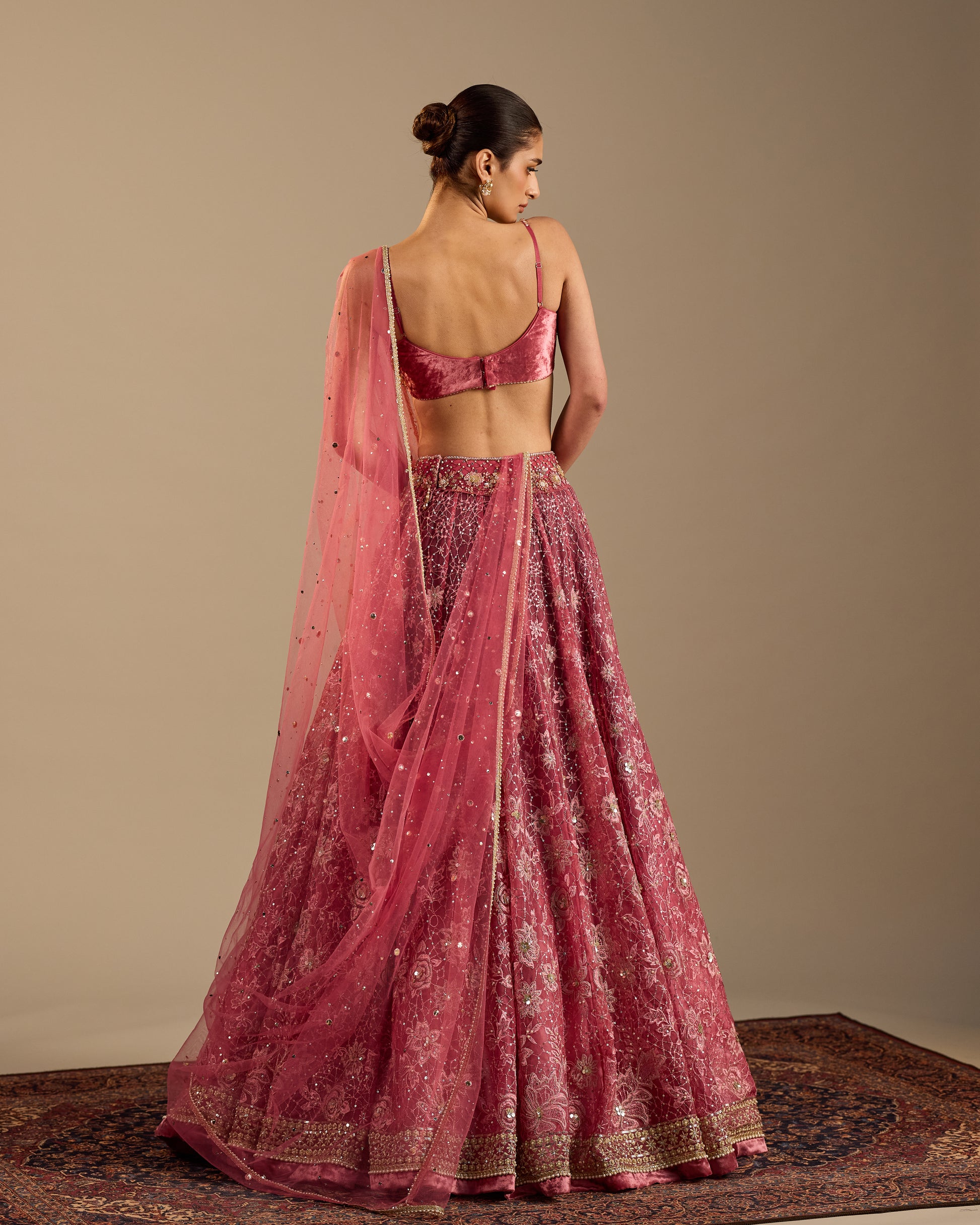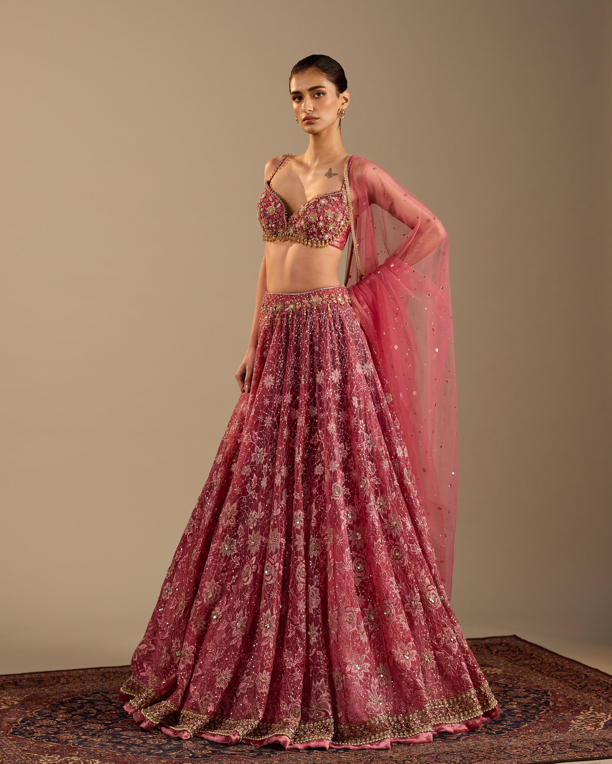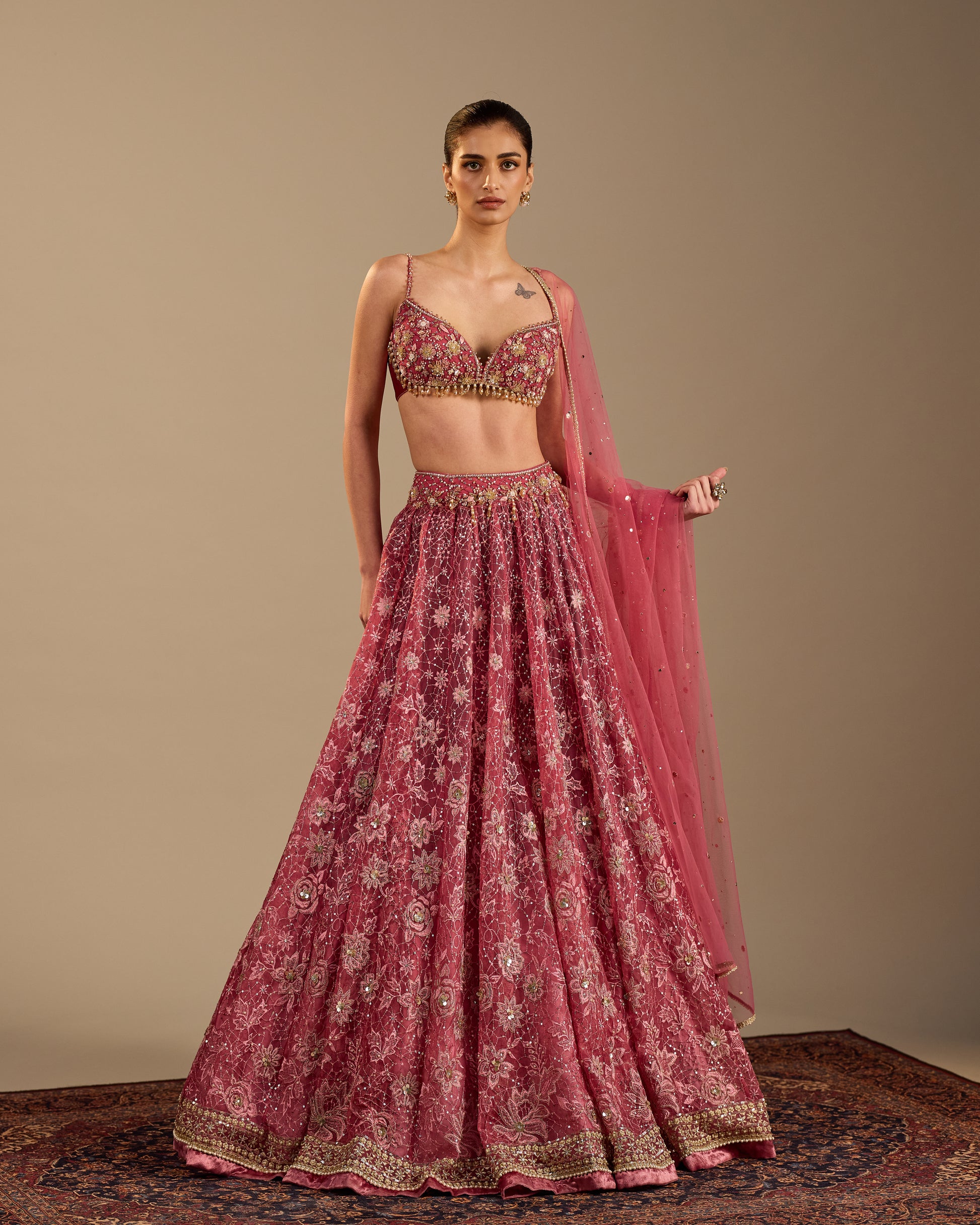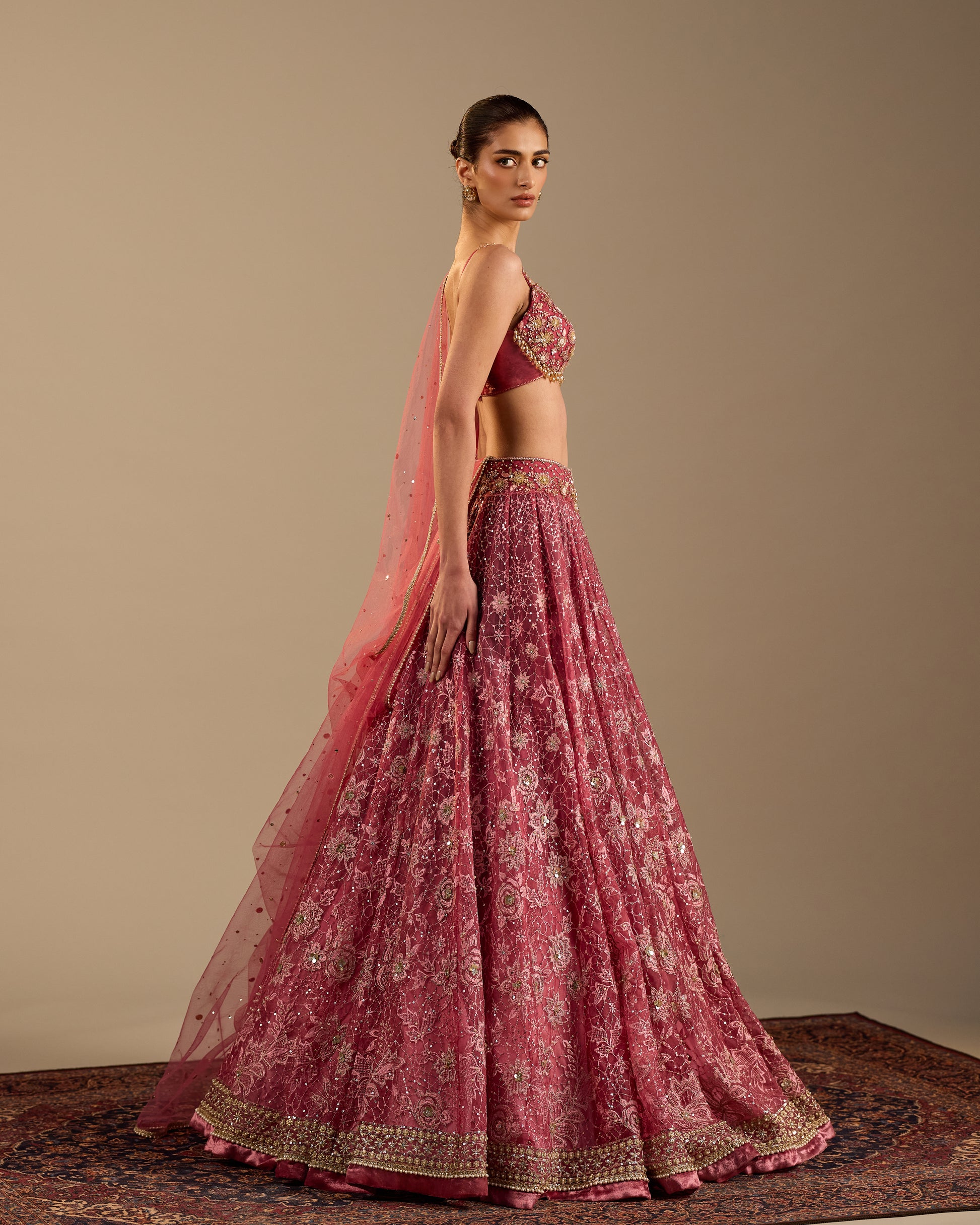 Rose pink embroidered organza lehenga. It is paired with hand embroidered blouse and mukaish embroidered tulle dupatta