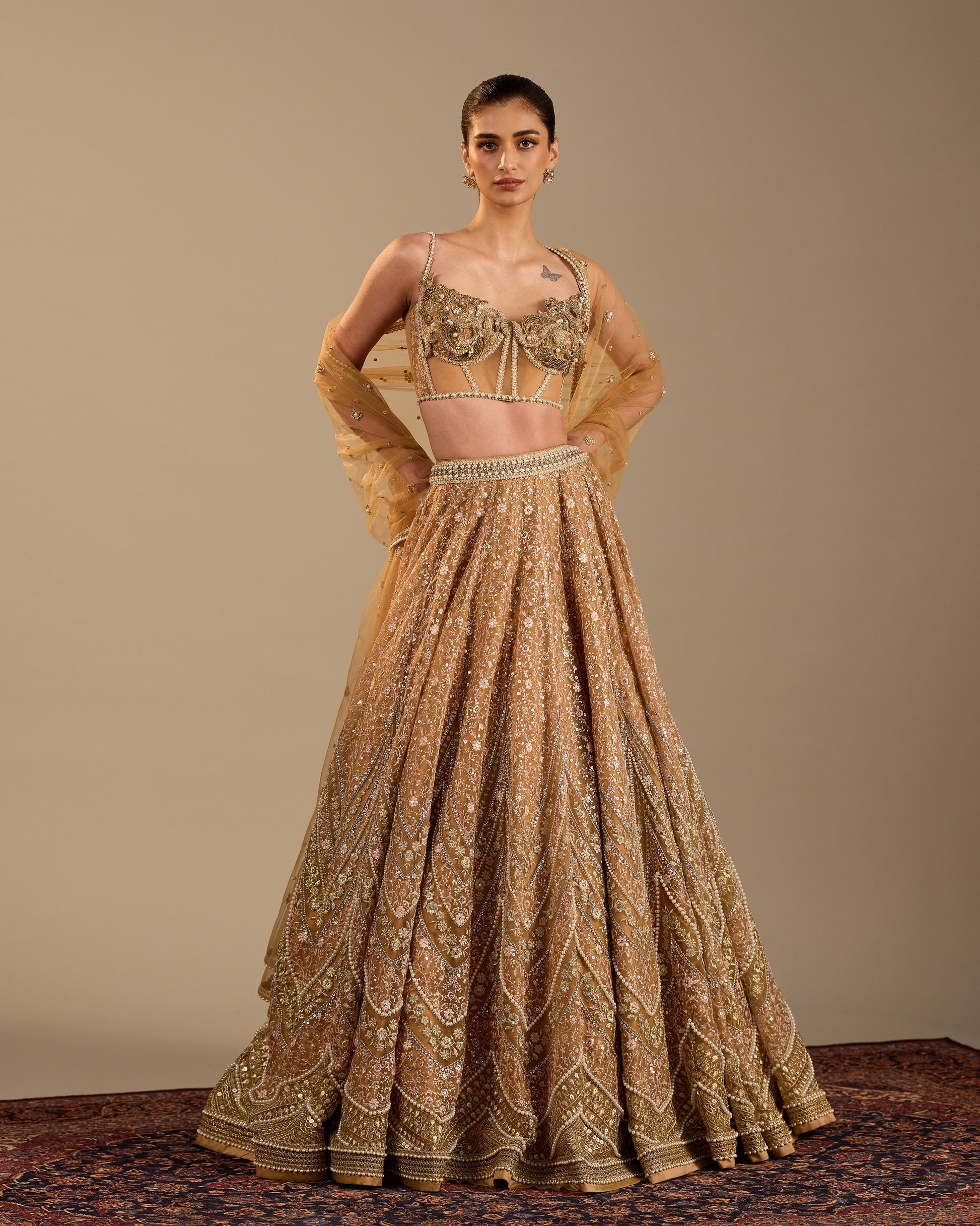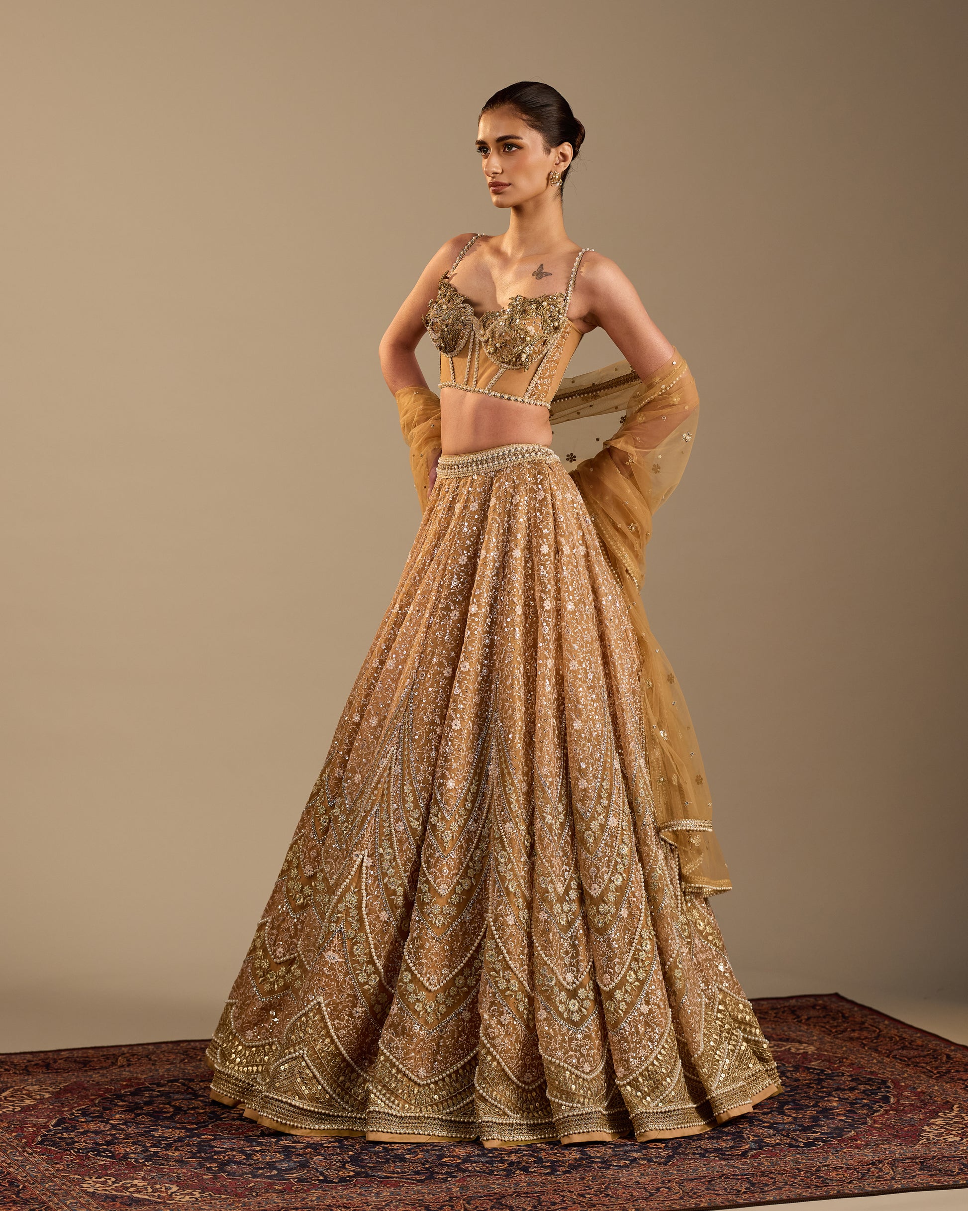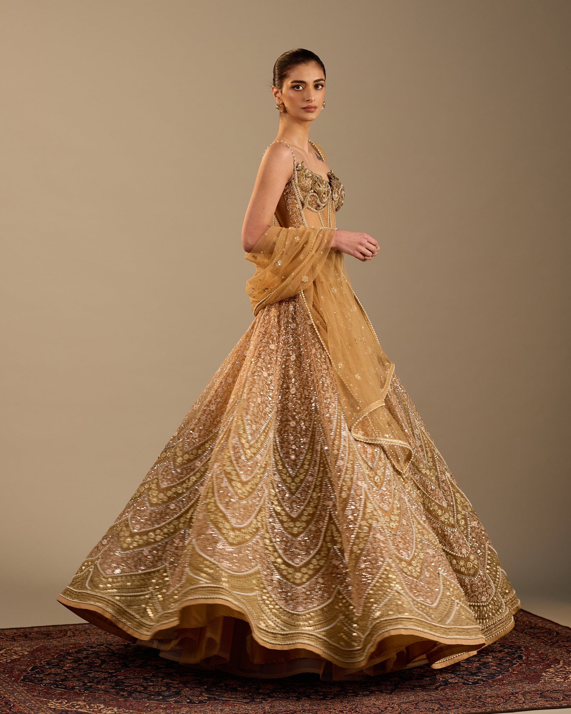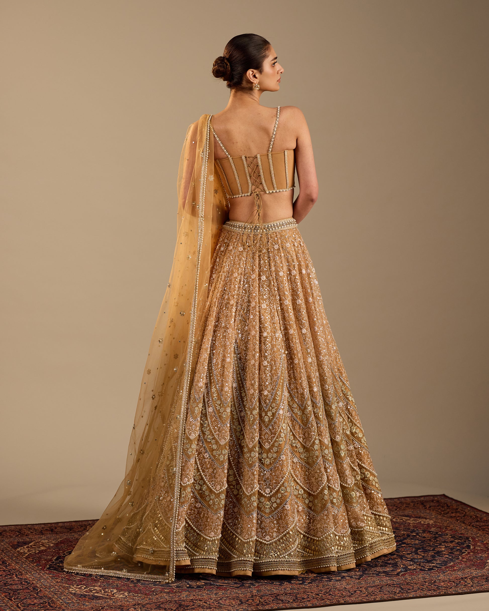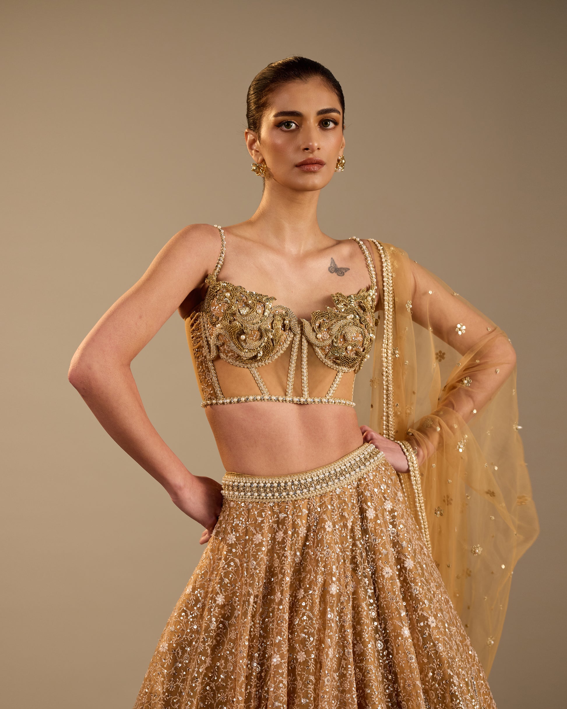 Golden beige embroidered organza lehenga set. It is paired with corset blouse in a complimenting colour enhanced with zardozi embroidered floral detail and embroidered dupatta