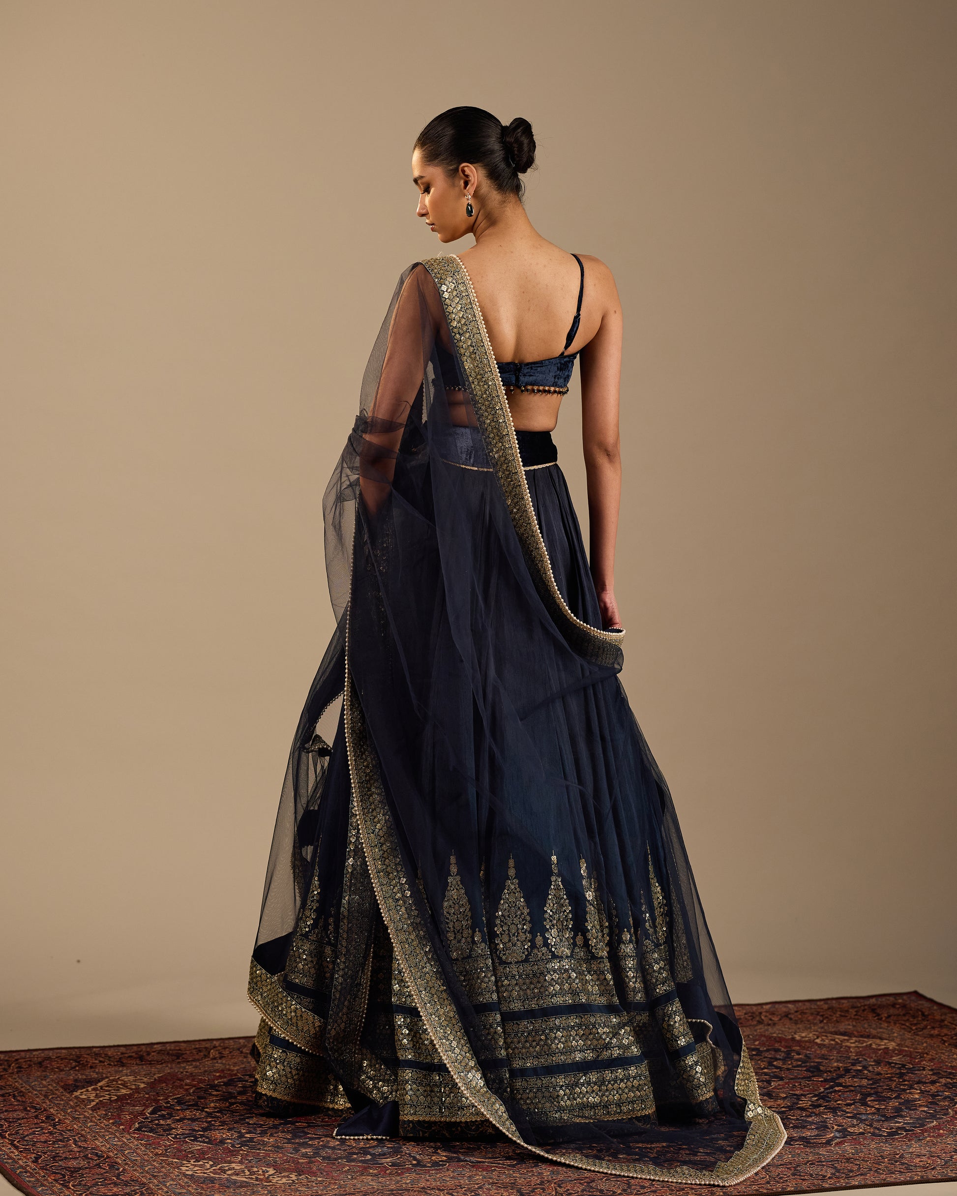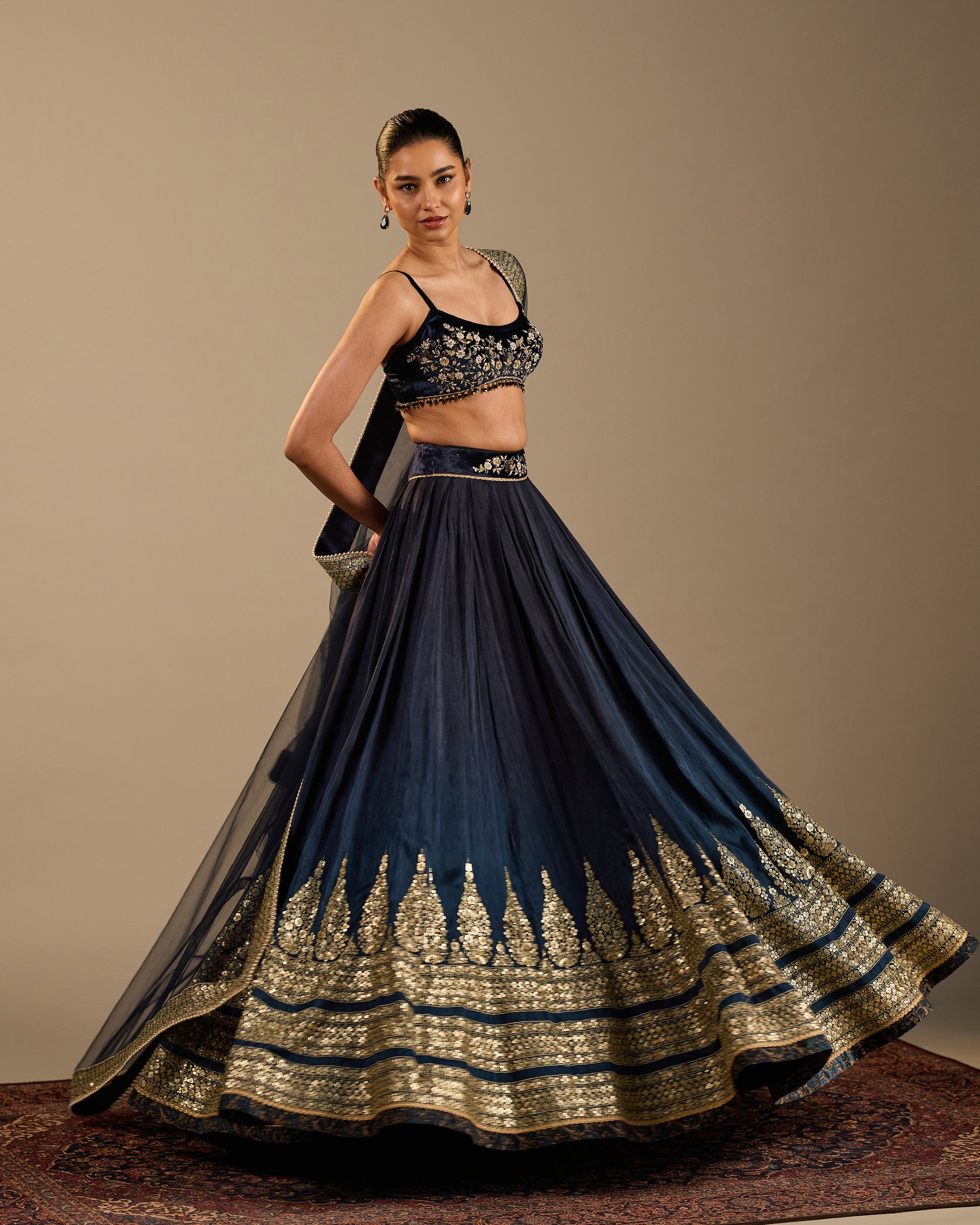 Featuring ombre shaded lehenga with embroidered border detail. It is paired with hand embroidered velvet blouse and complimenting tulle dupatta.