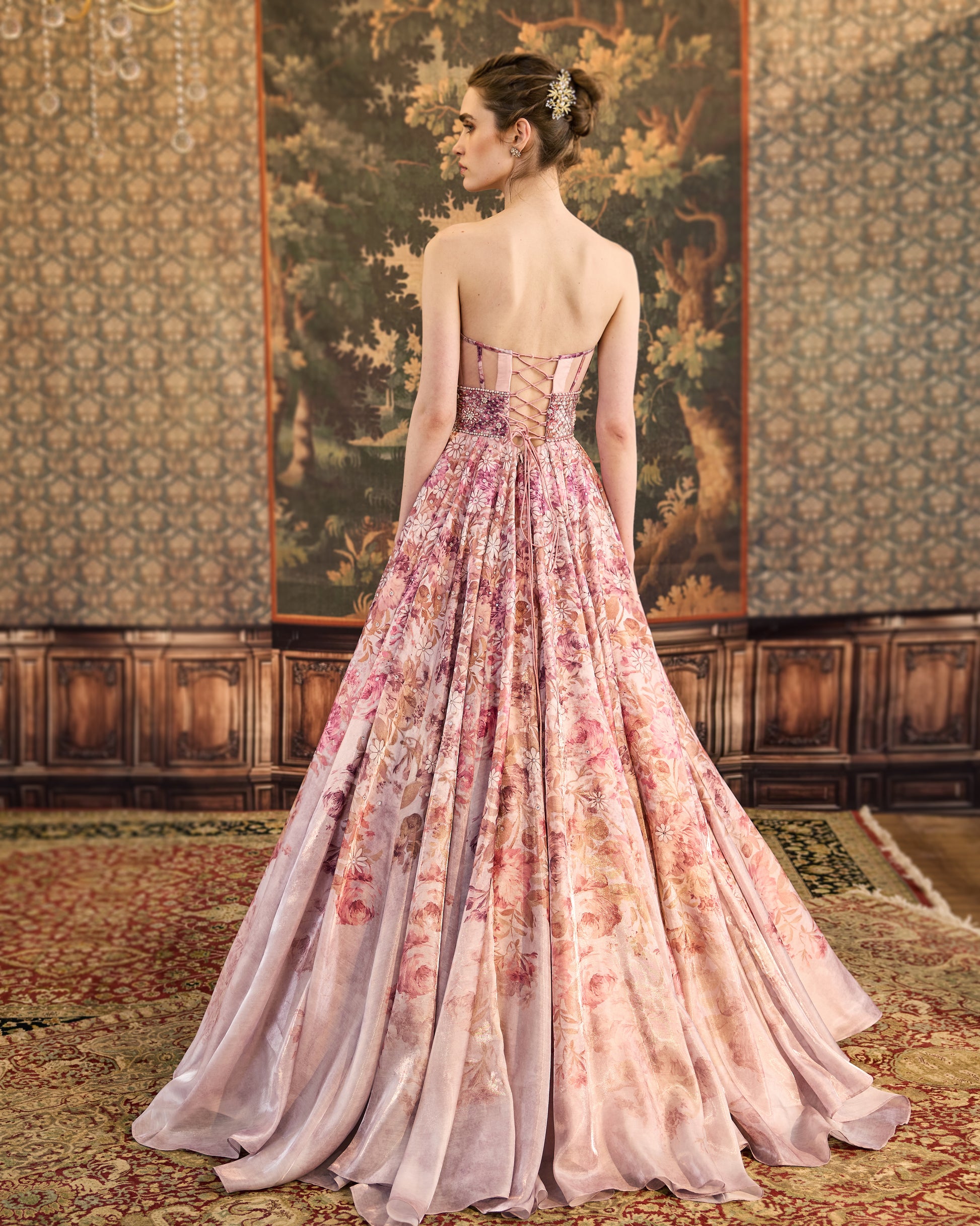 Peonies print gown with intricate hand embroidered bodice.