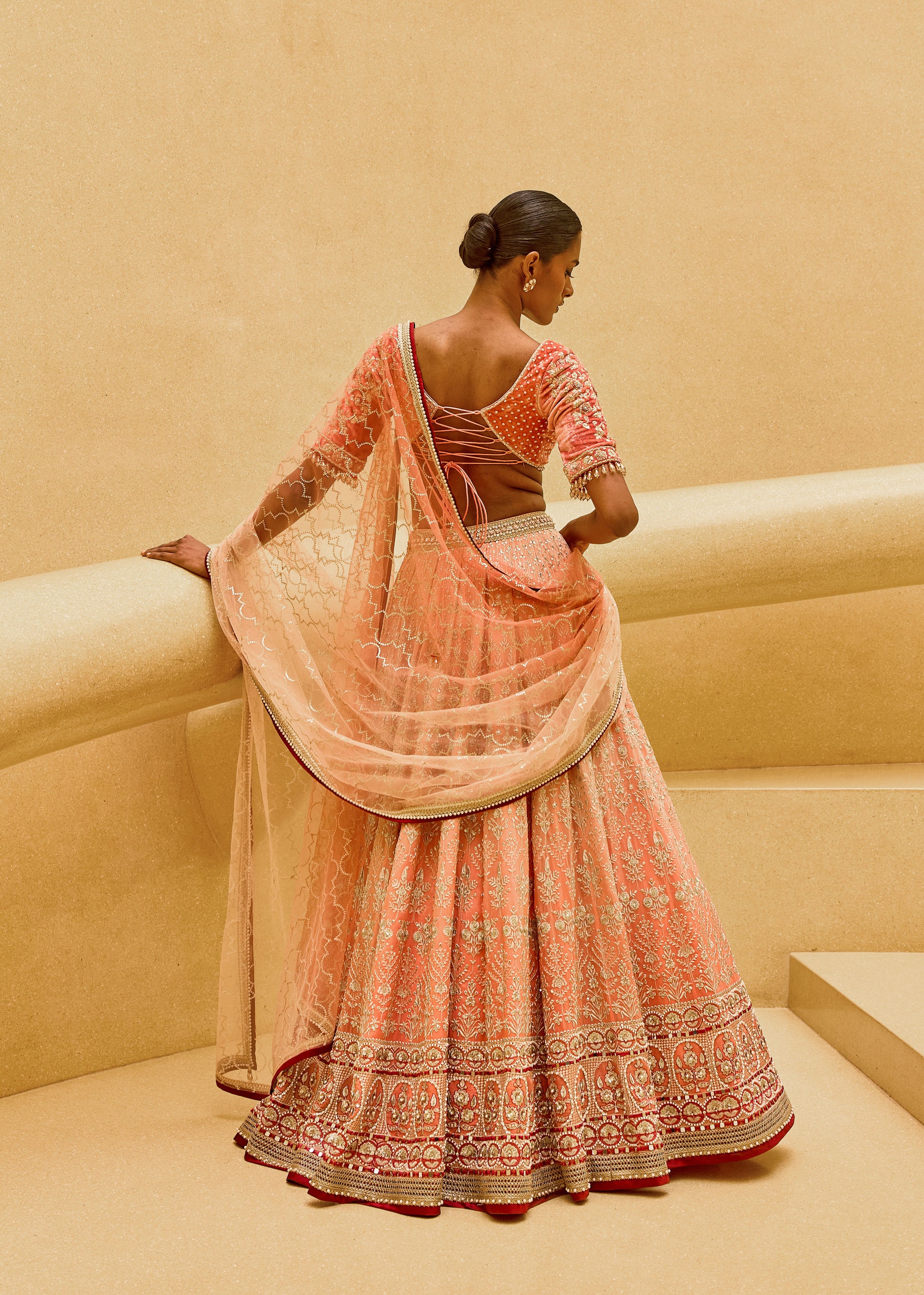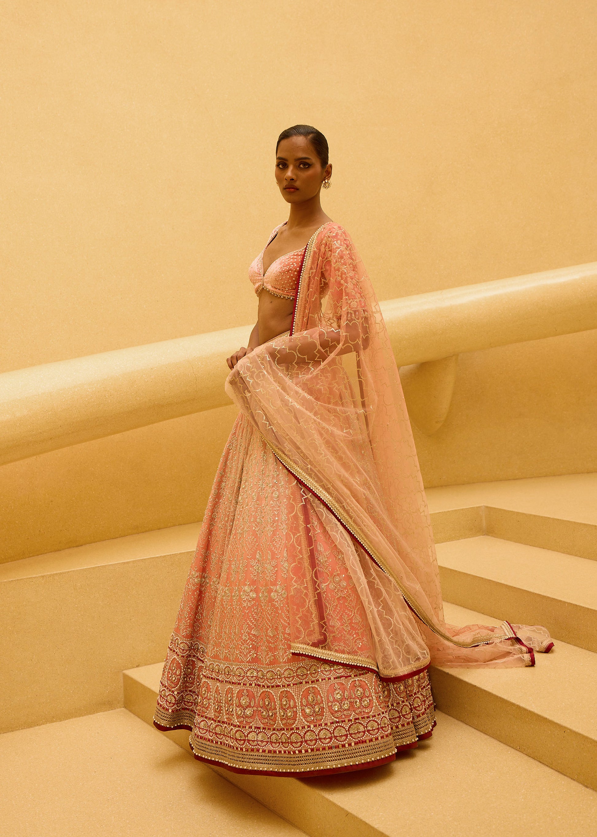 Featuring ombre pink embroidered lehenga set. It is paired with embroidered blouse and complimenting dupatta