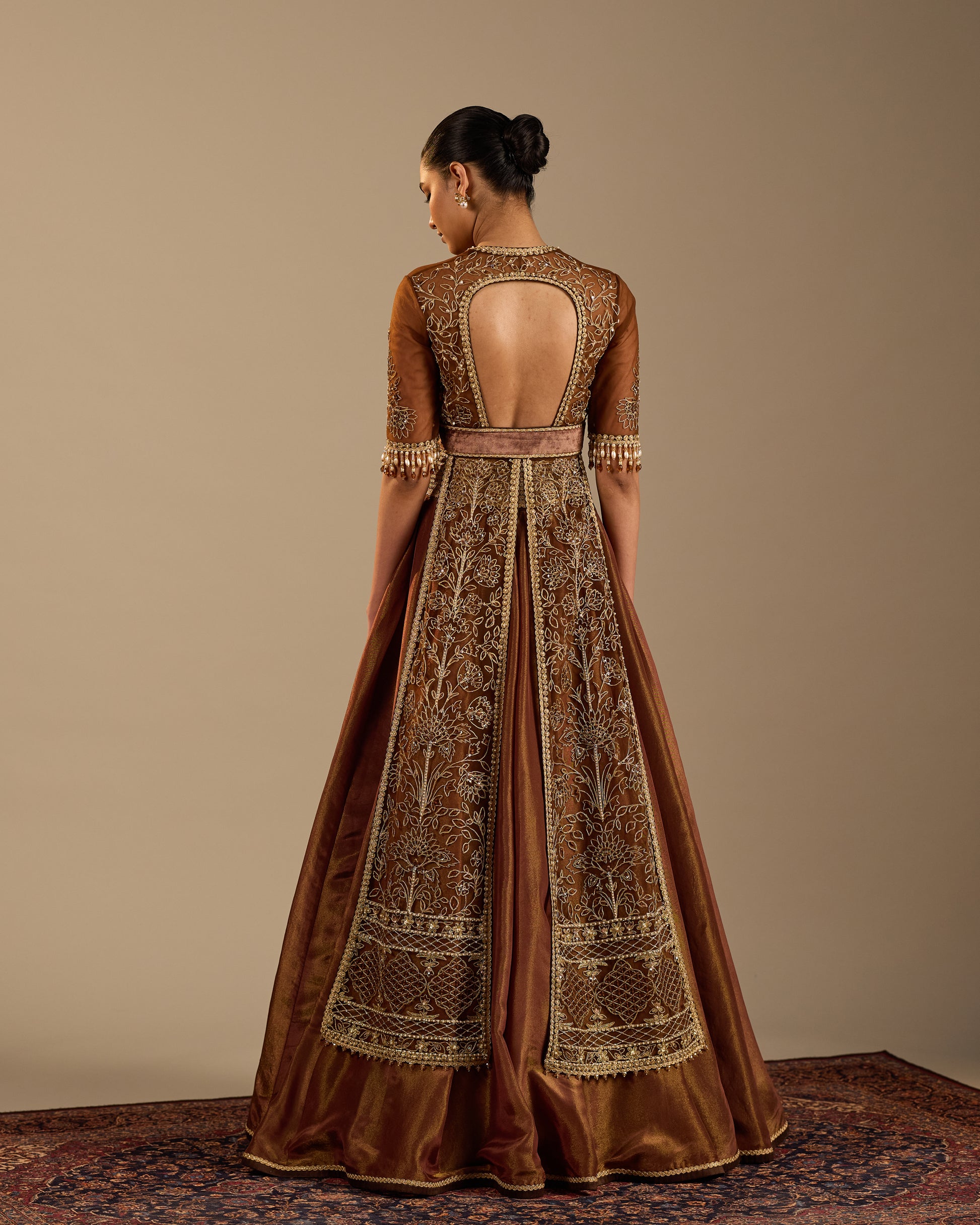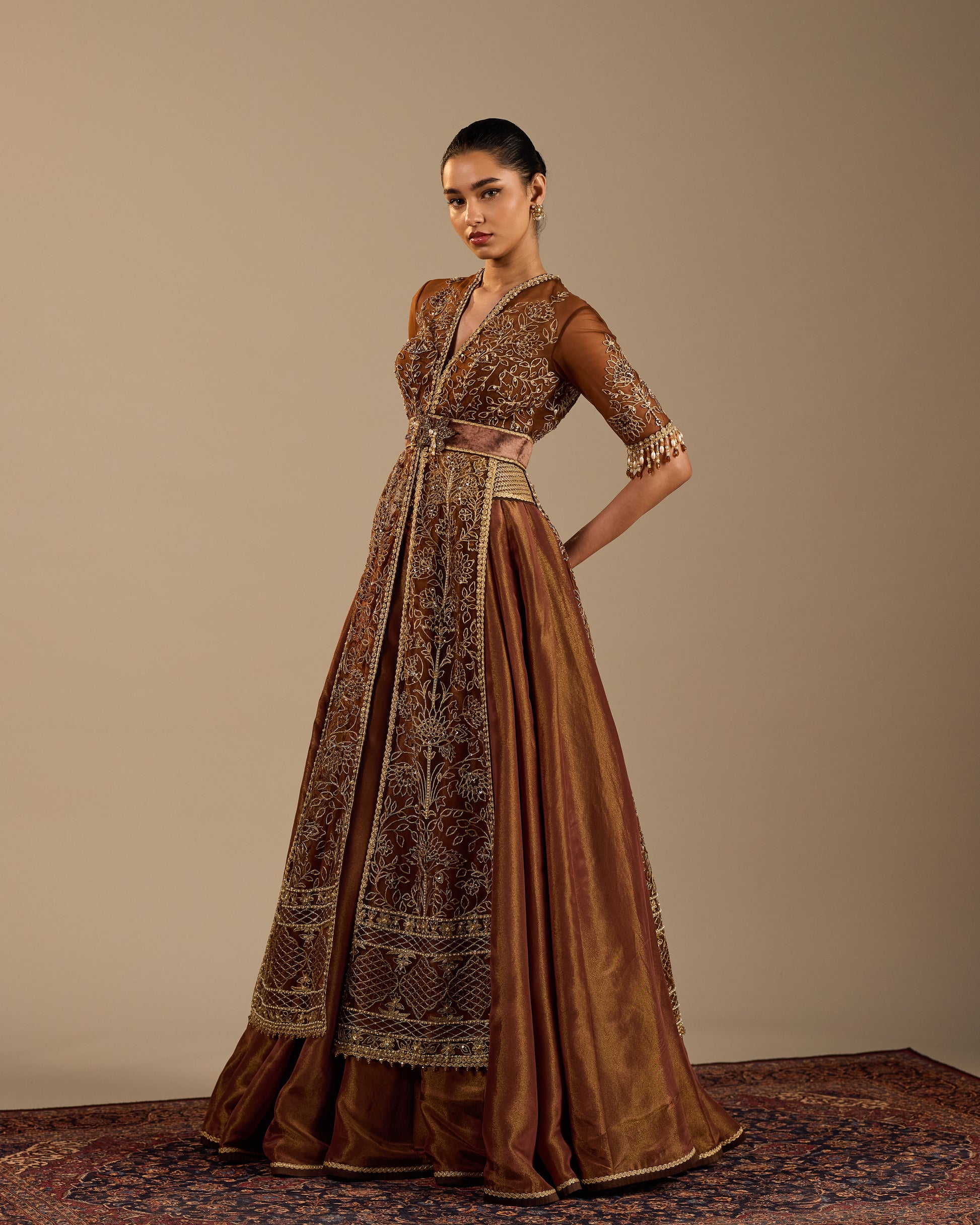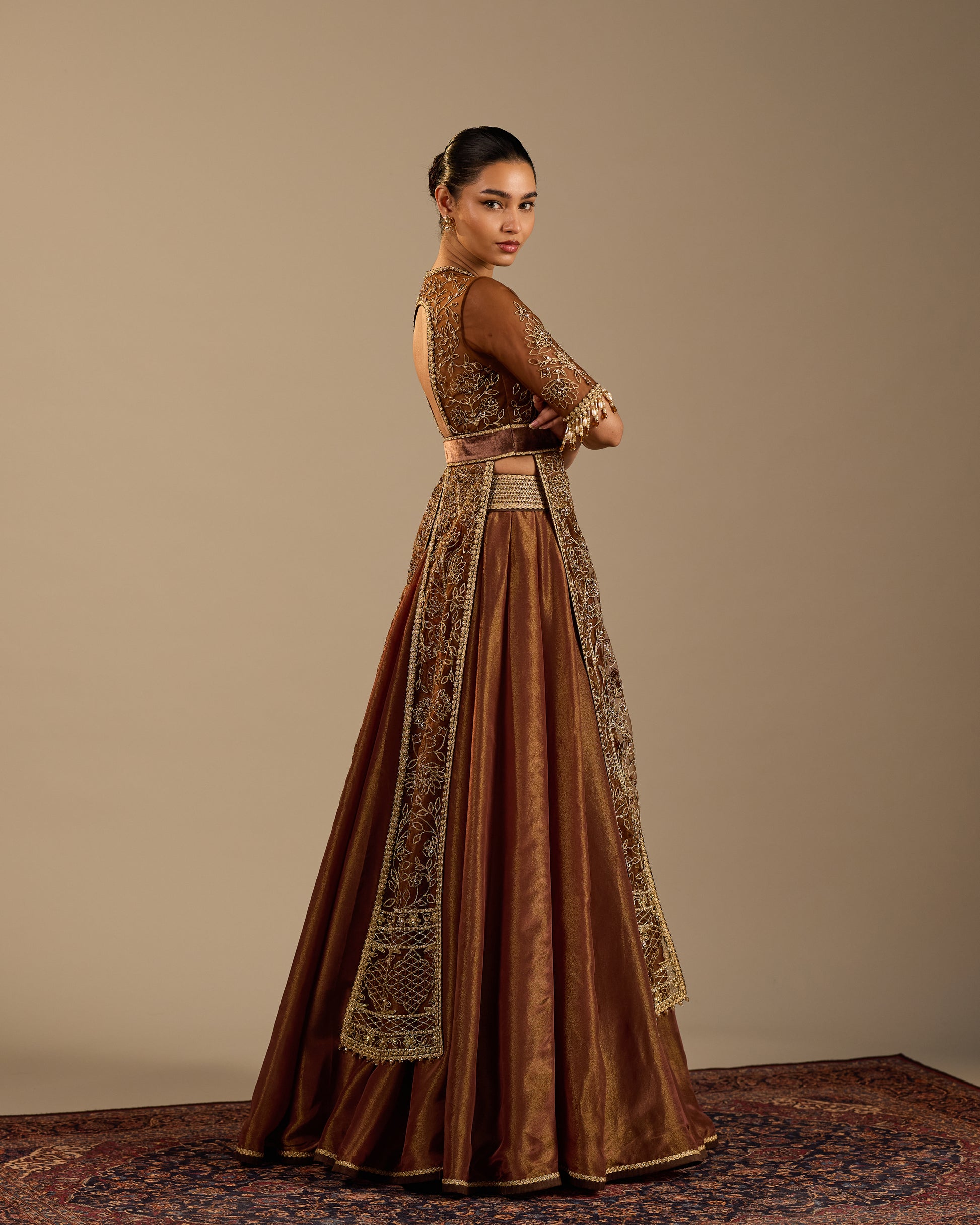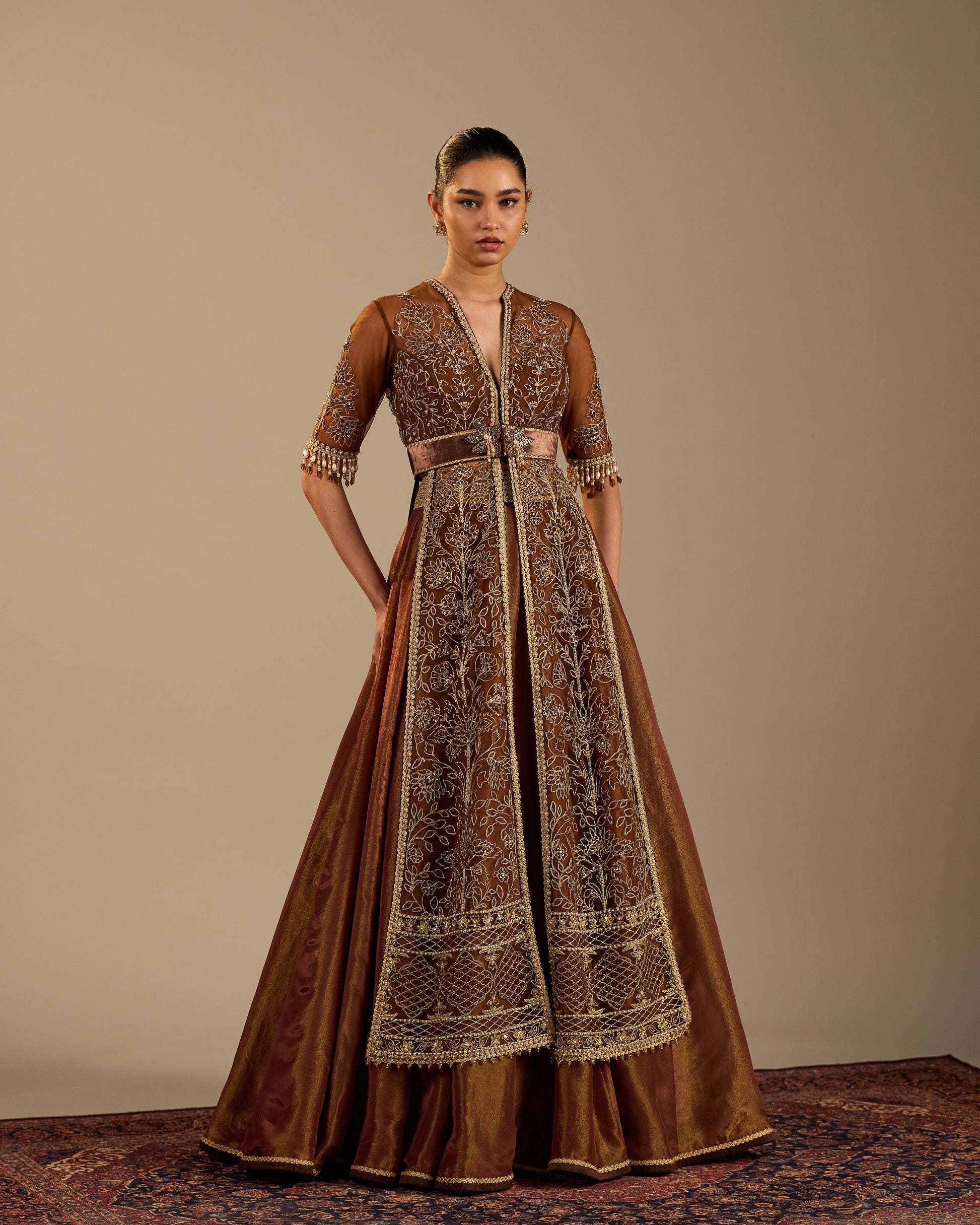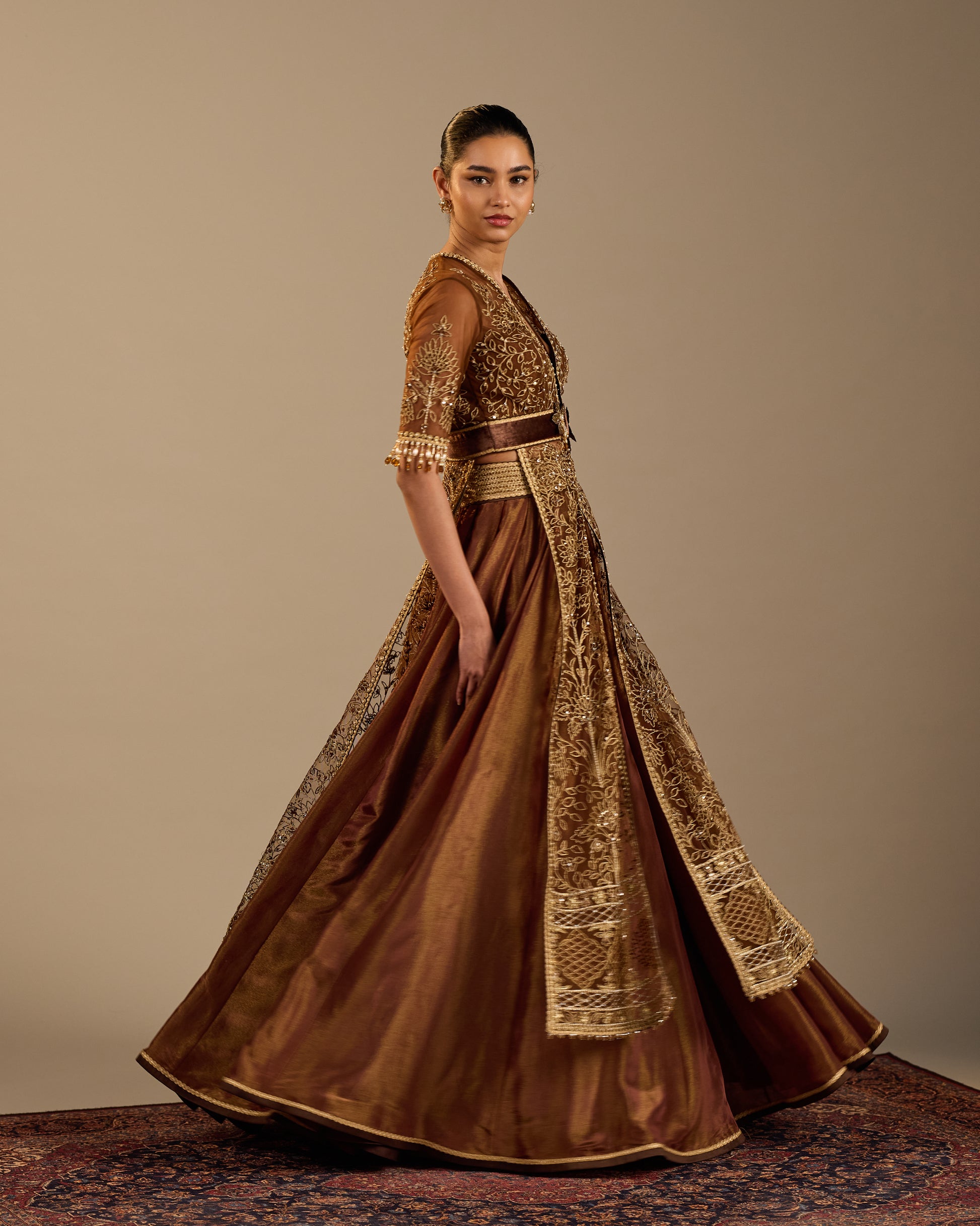 Our signature four panel embroidered jacket in copper gold shade. It is paired with tissue skirt in complimenting shade.