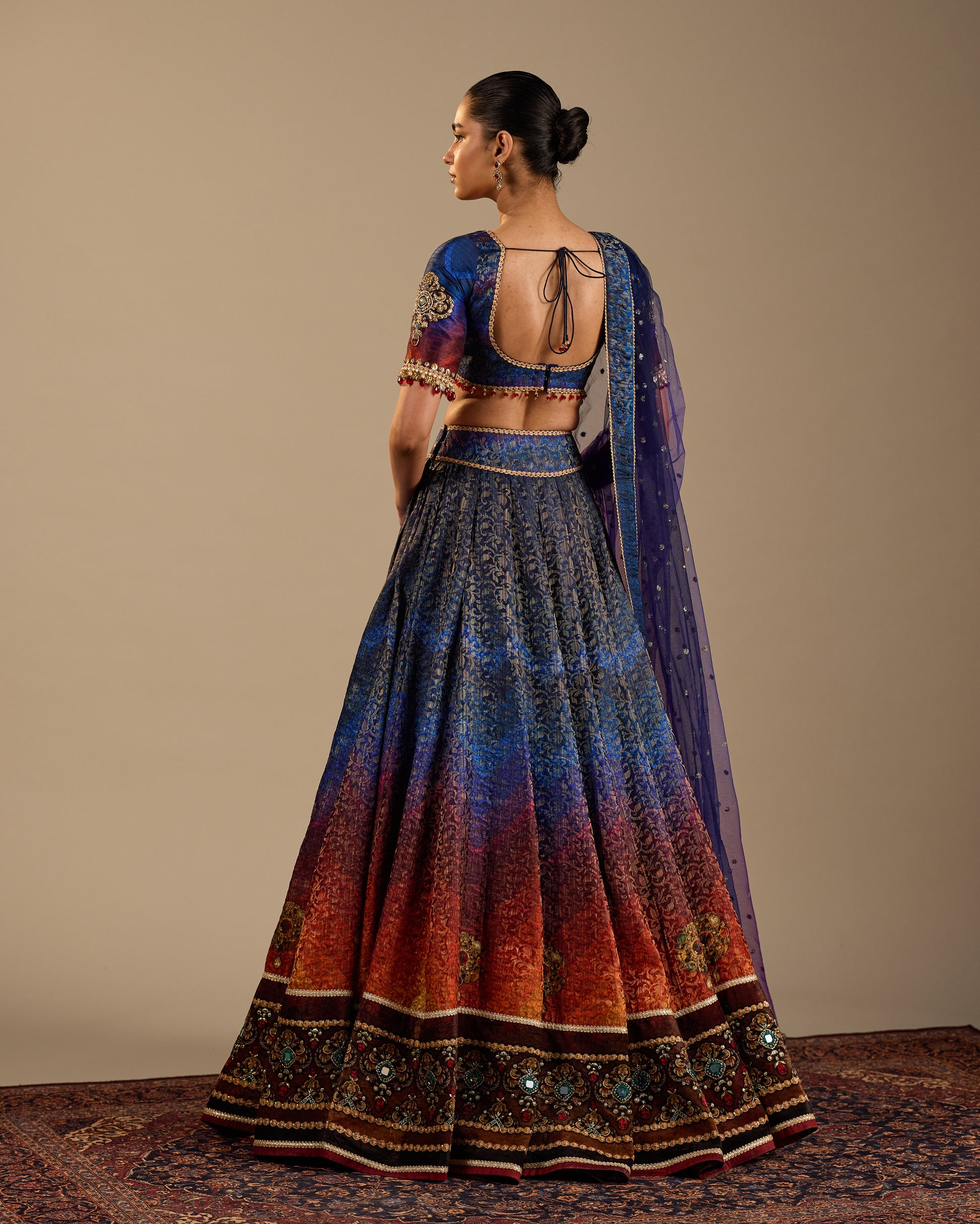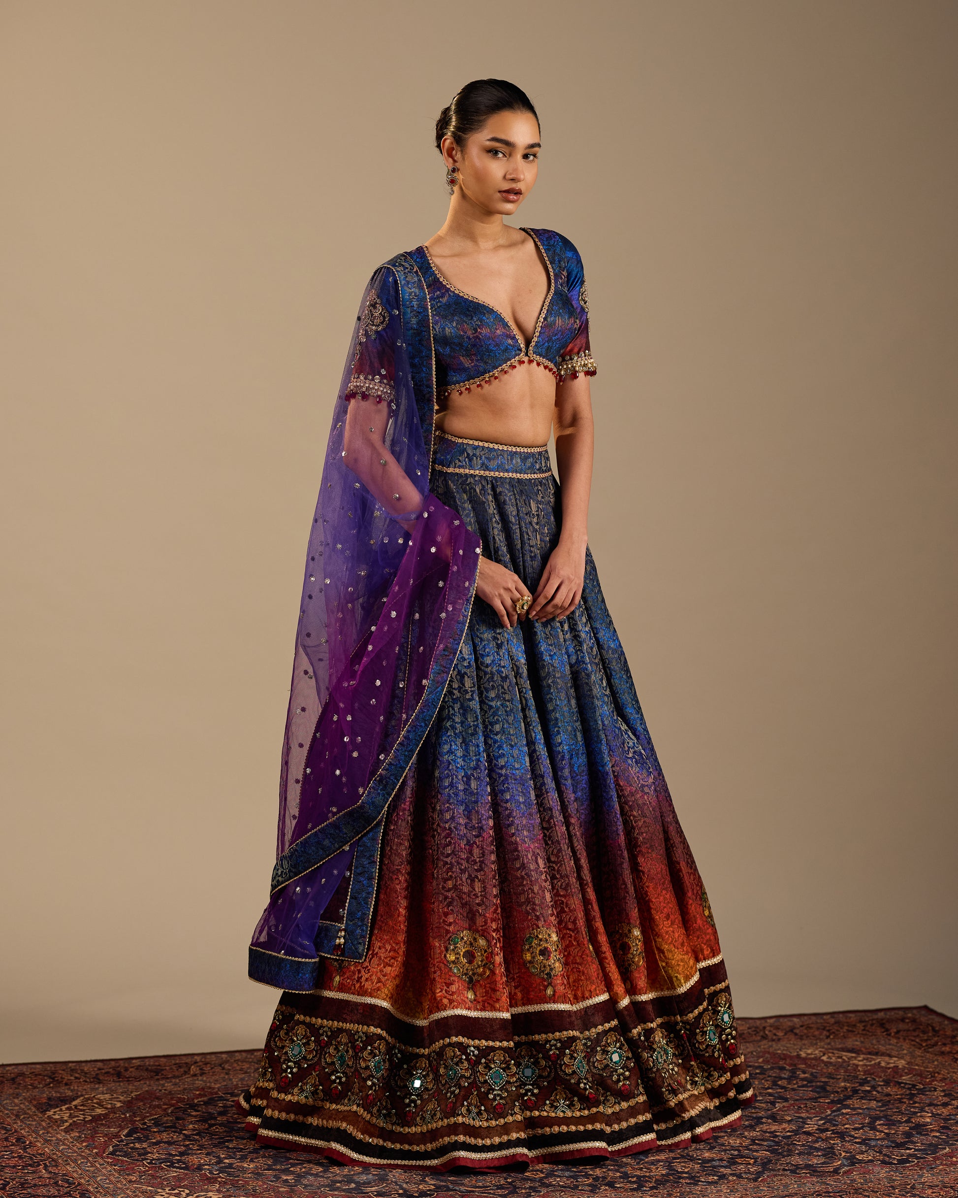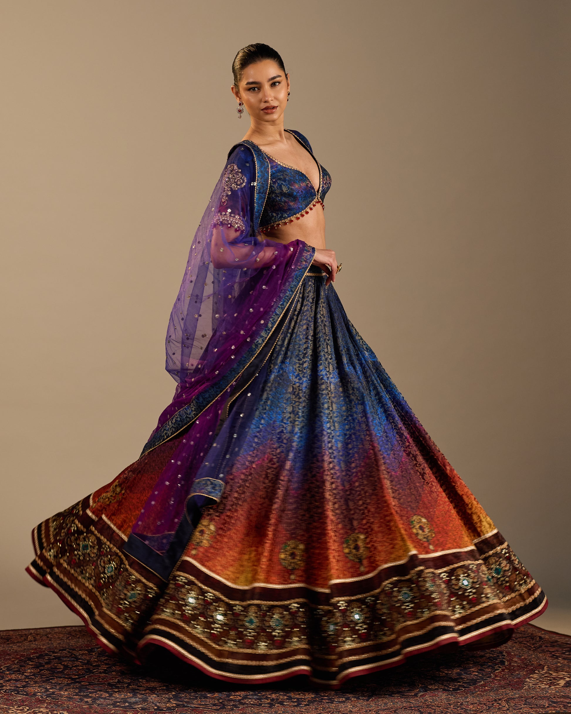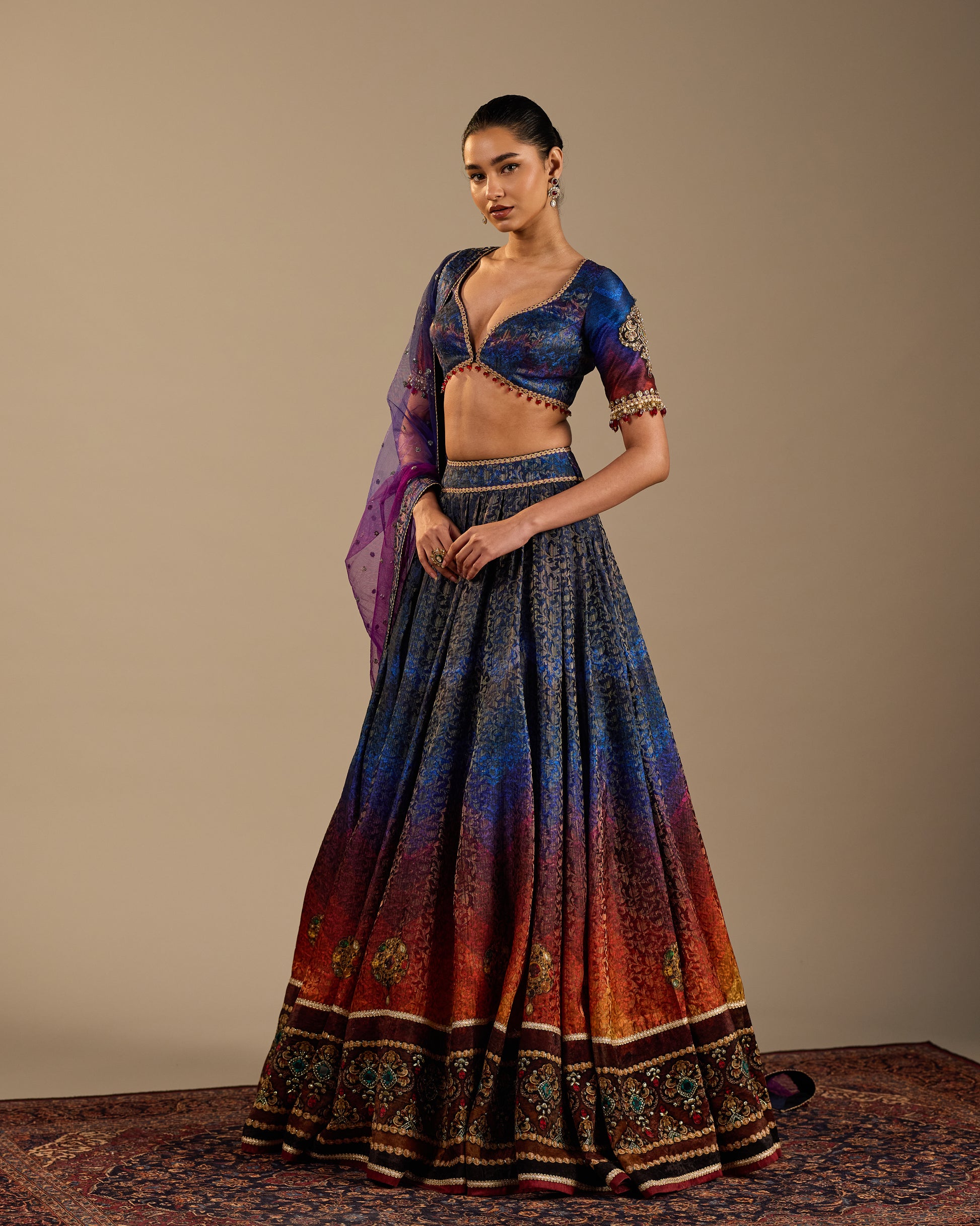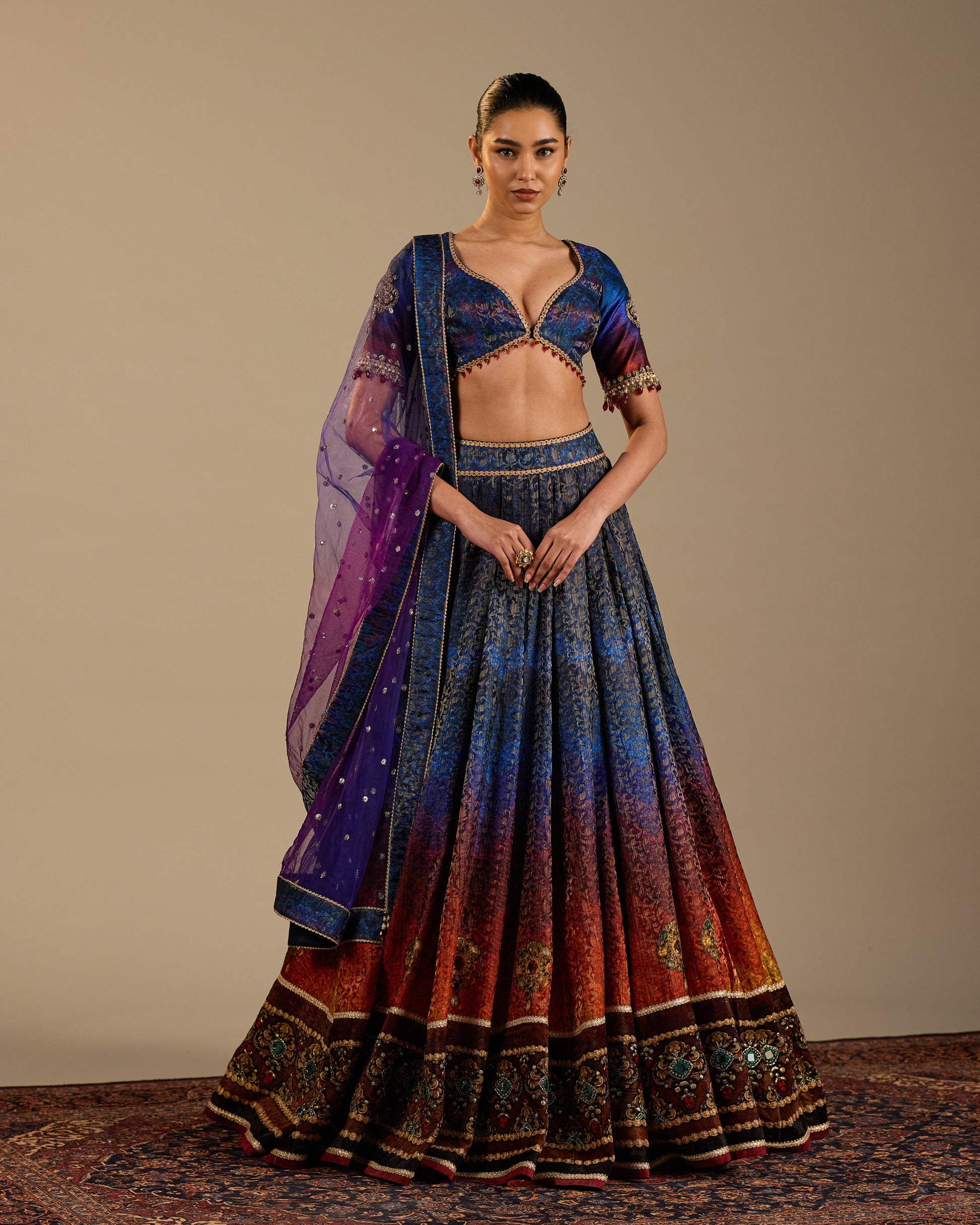 Sunset shade print brocade lehenga with embroidered border. It is paired with printed brocade blouse with distinct embroidered sleeve detail and shaded dupatta