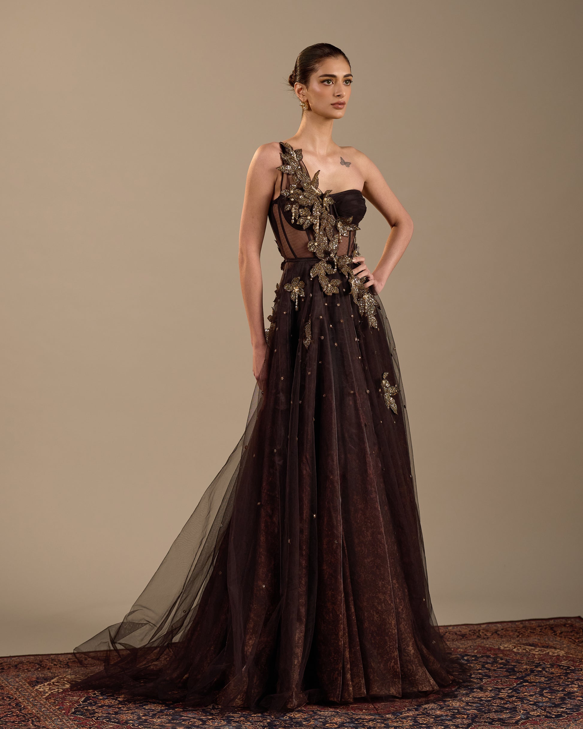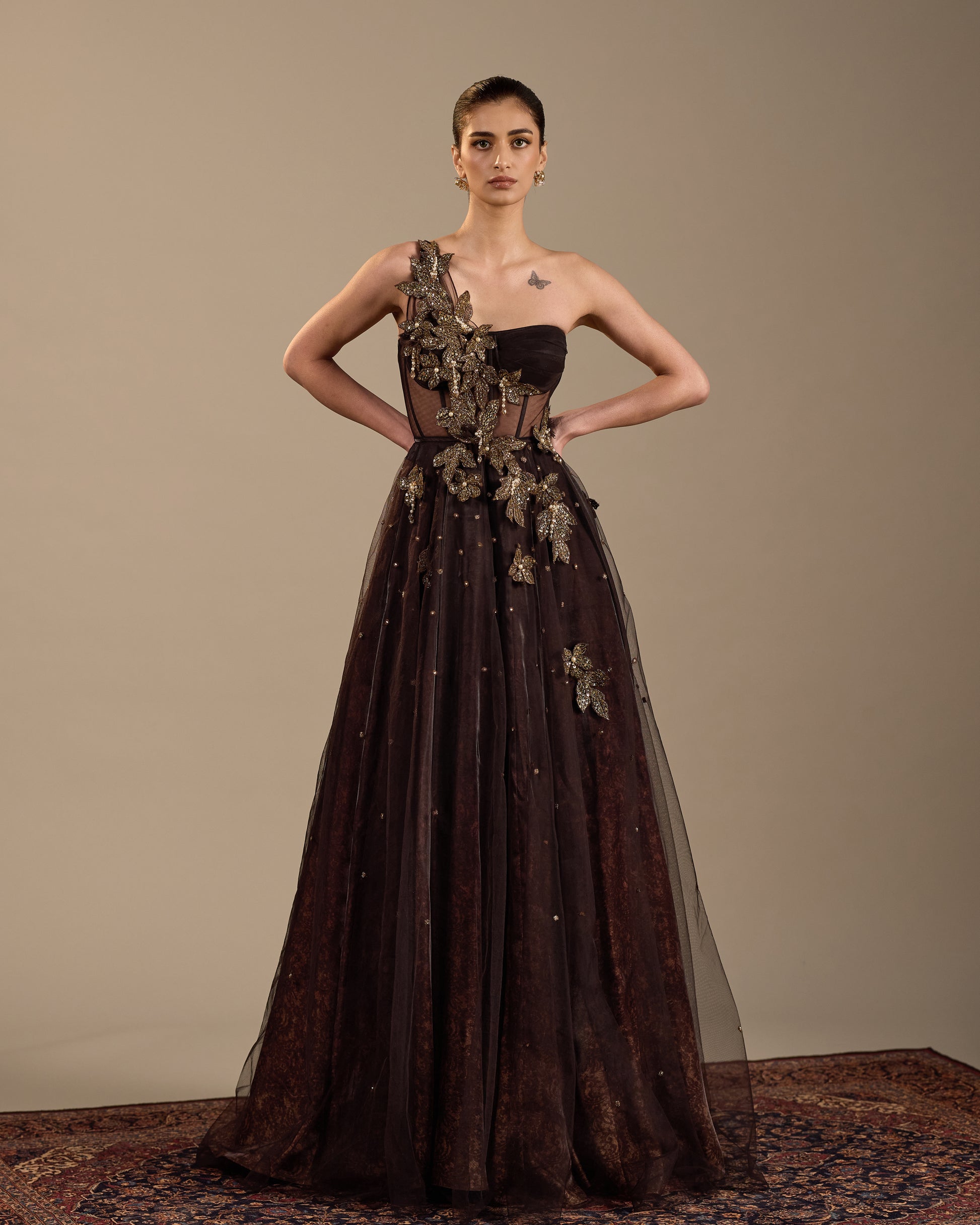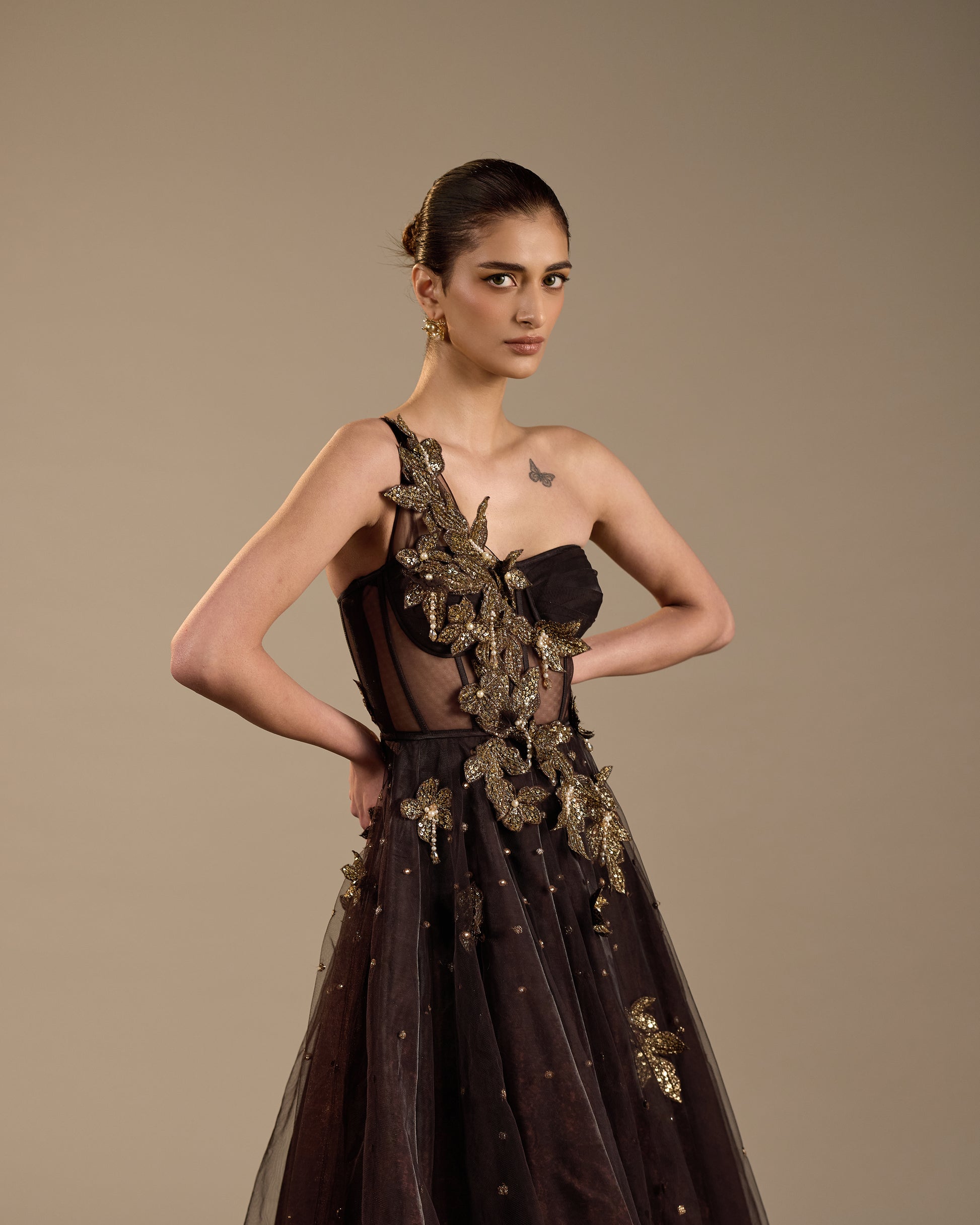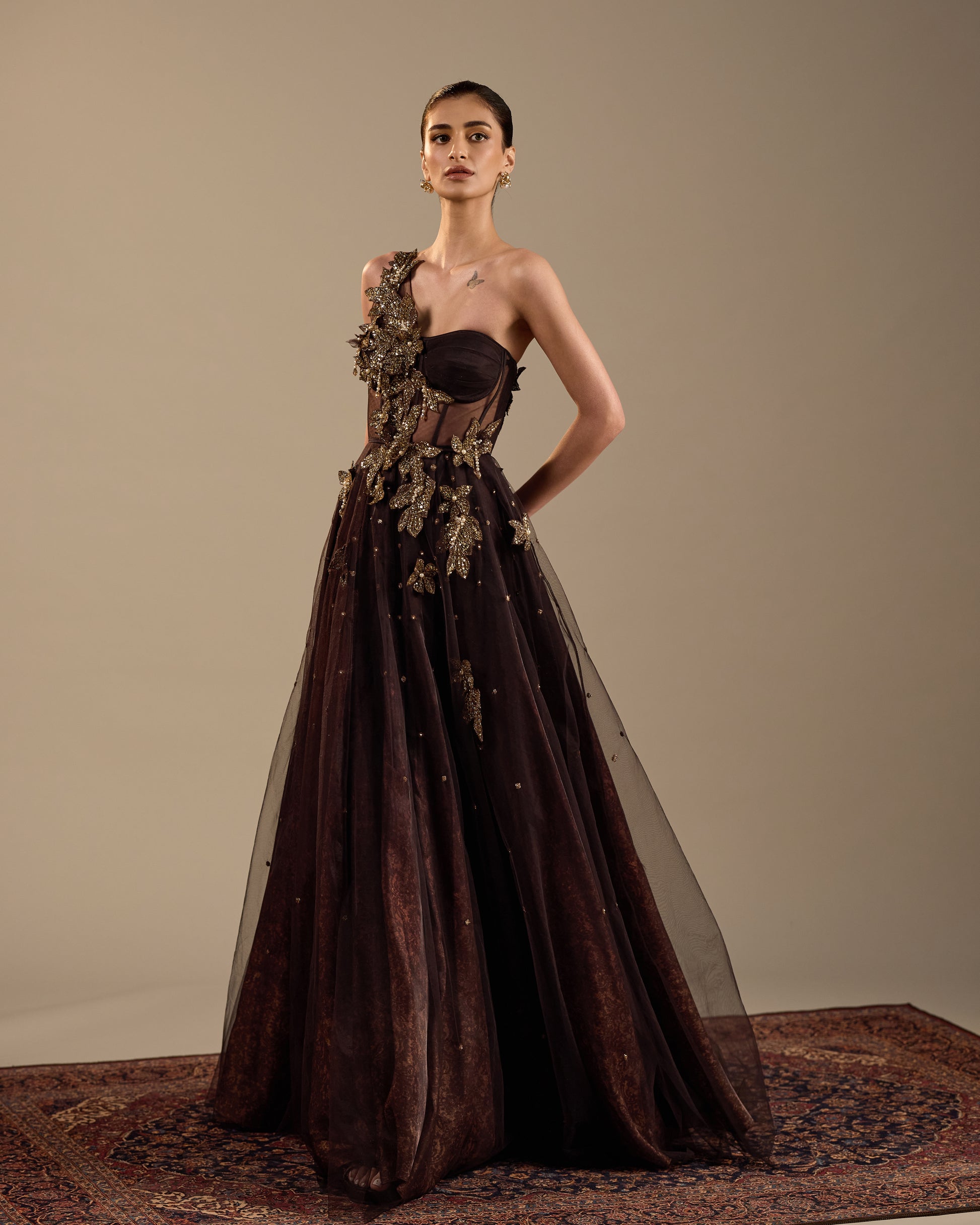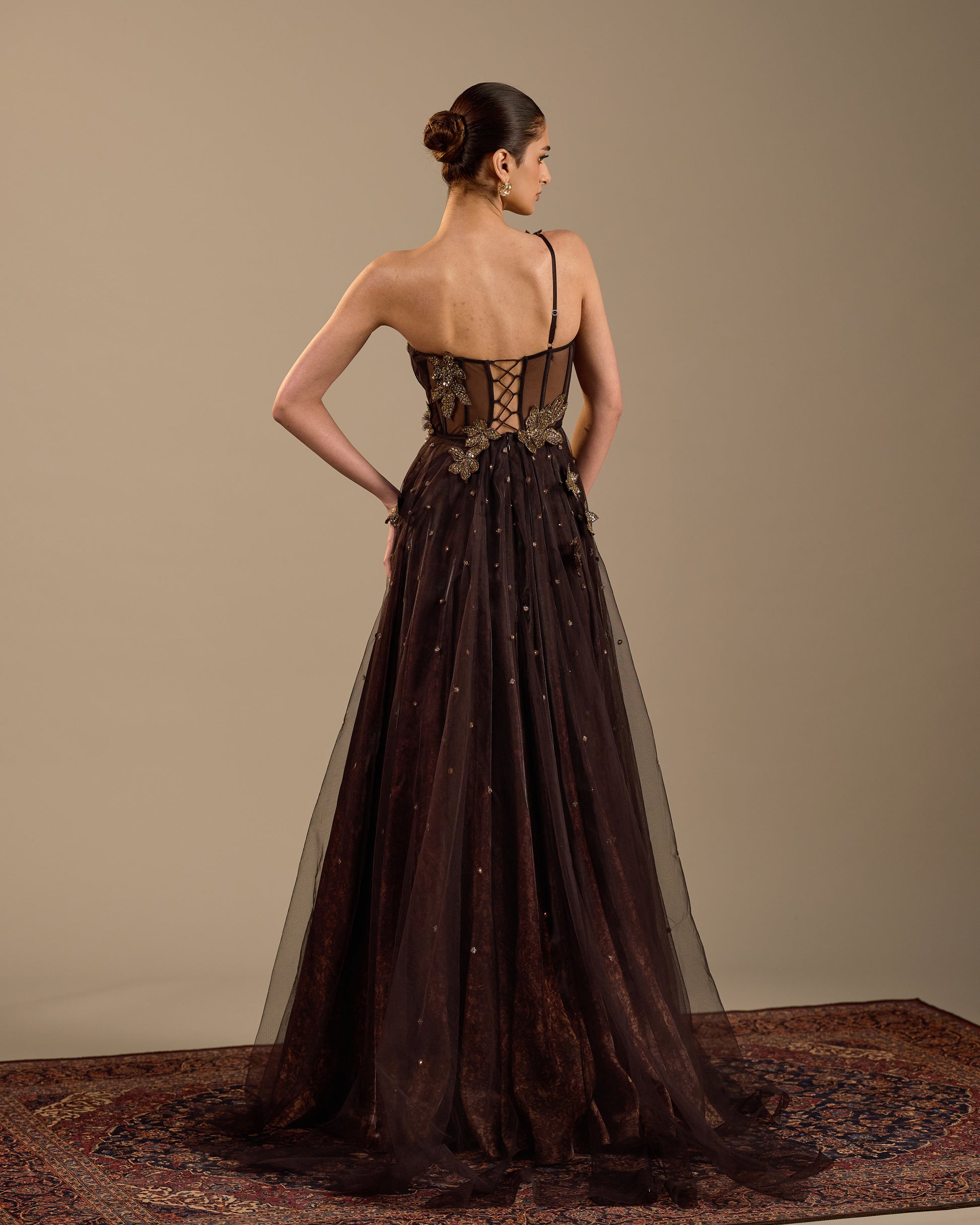 Featuring dark brown corset gown. It is enhanced with hand embroidered floral details.