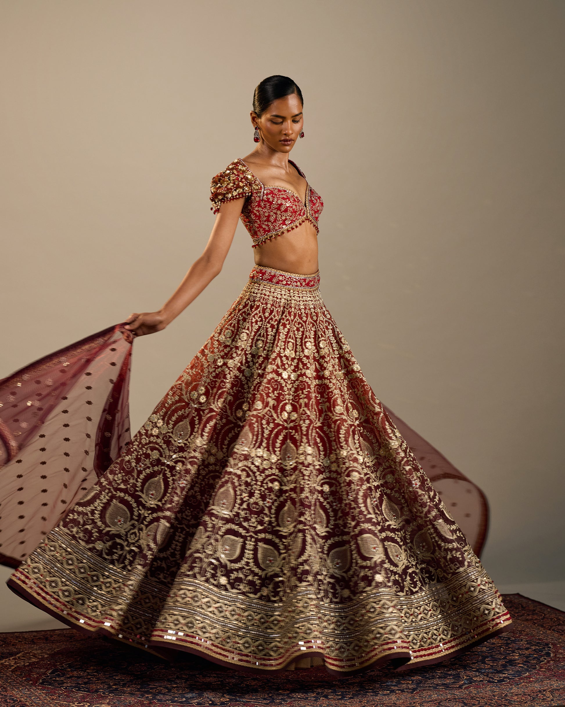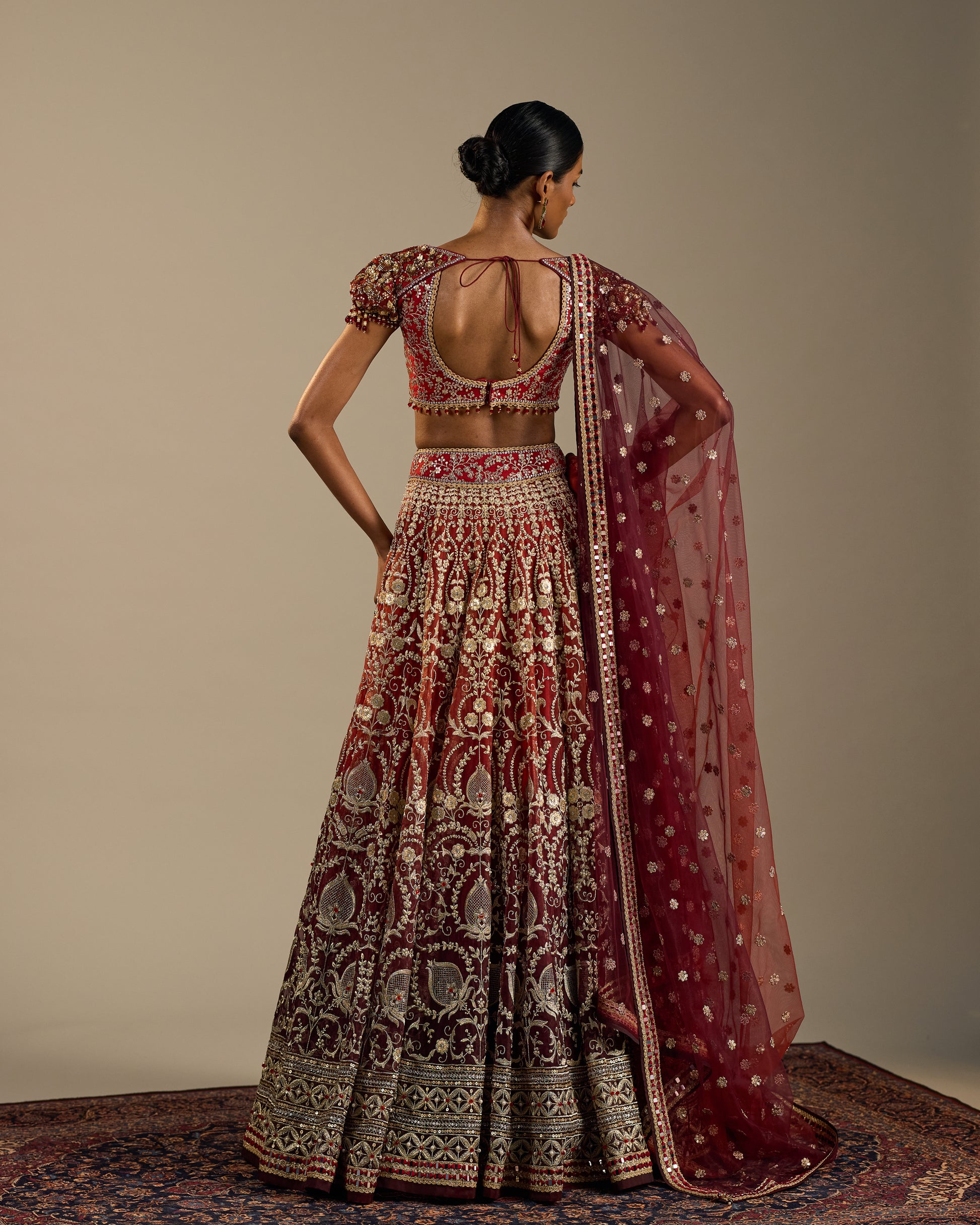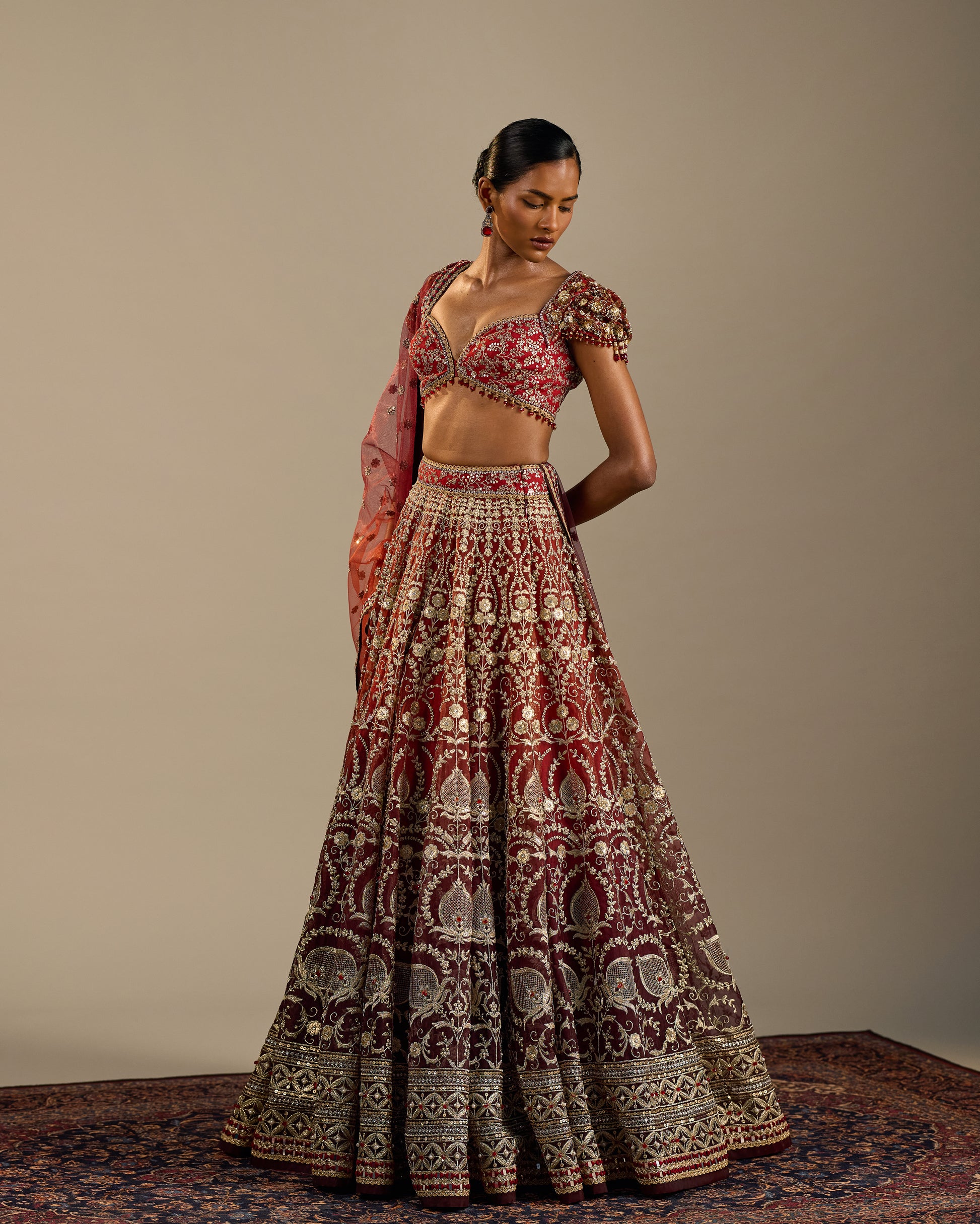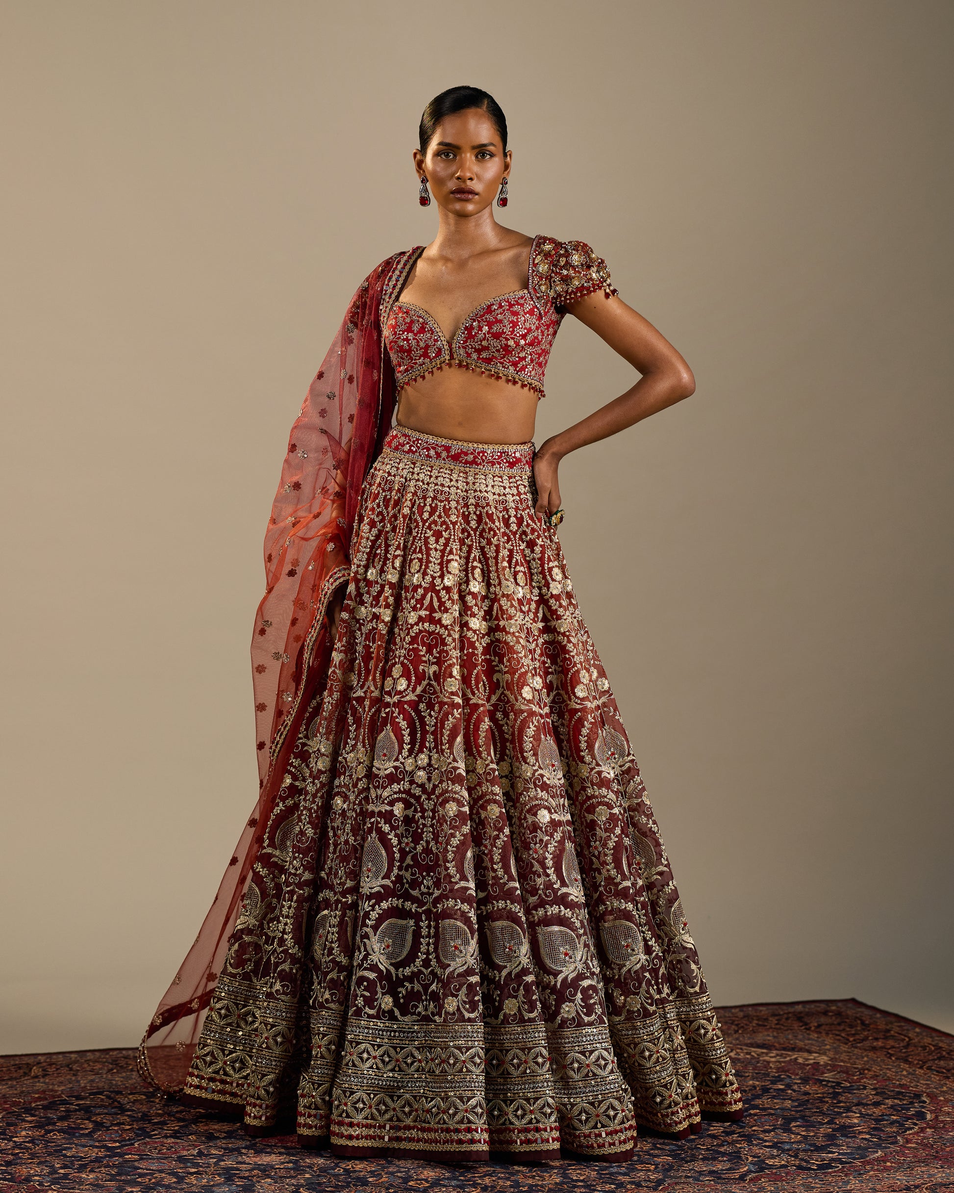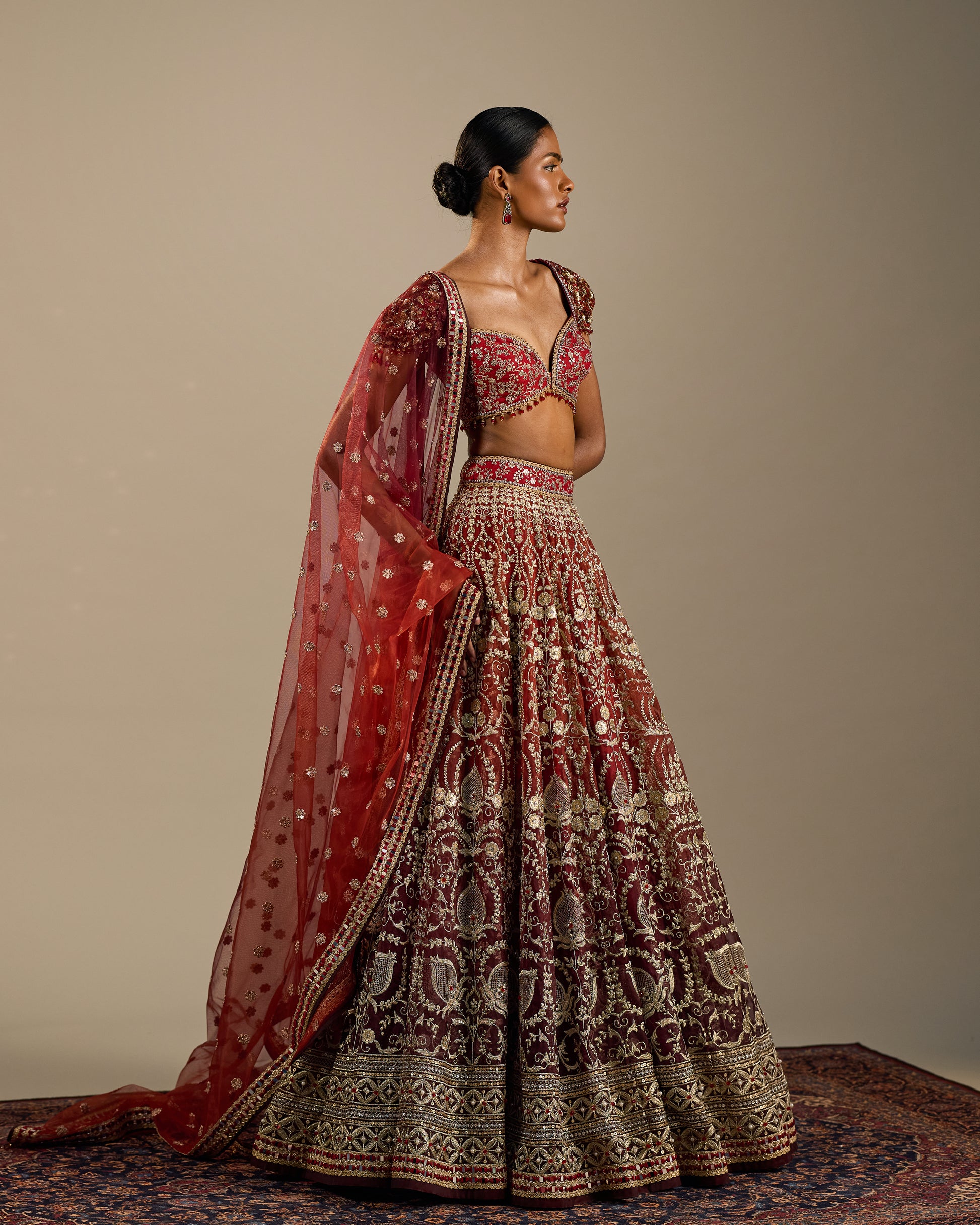 Red embroidered organza lehenga. It is paired with embroidered tulle blouse with hand embroidered details and embroidered tulle dupatta