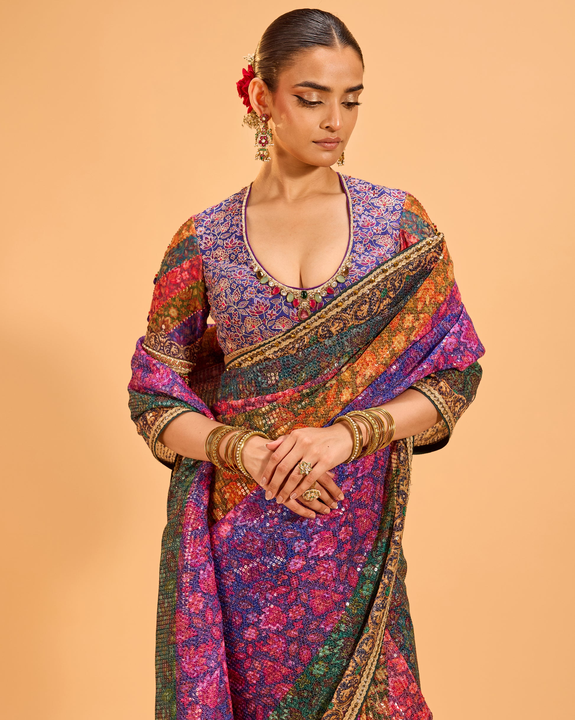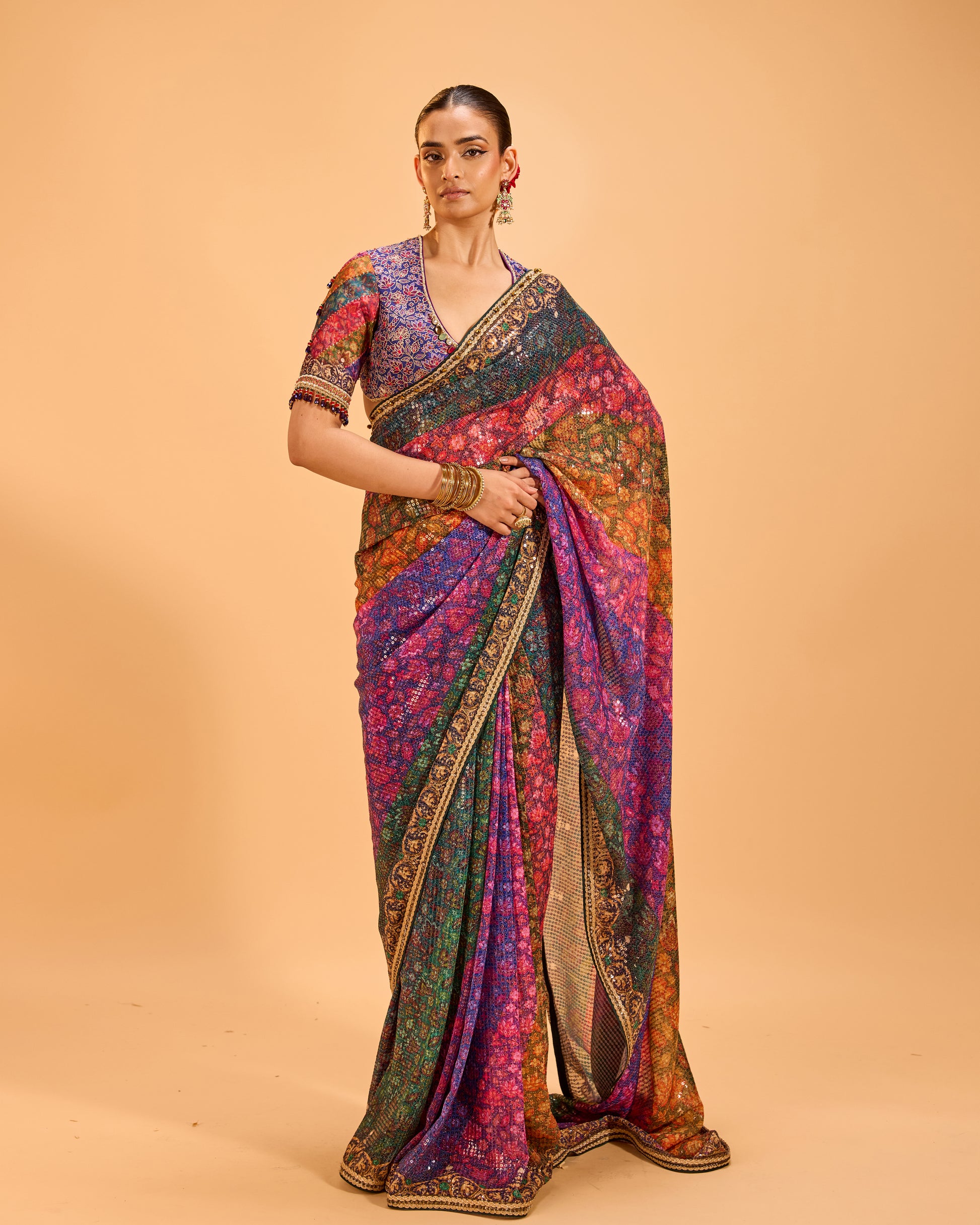 Featuring multicolour saree on sequin embroidered georgette base. It is paired with hand embroidered blouse on dupion base.