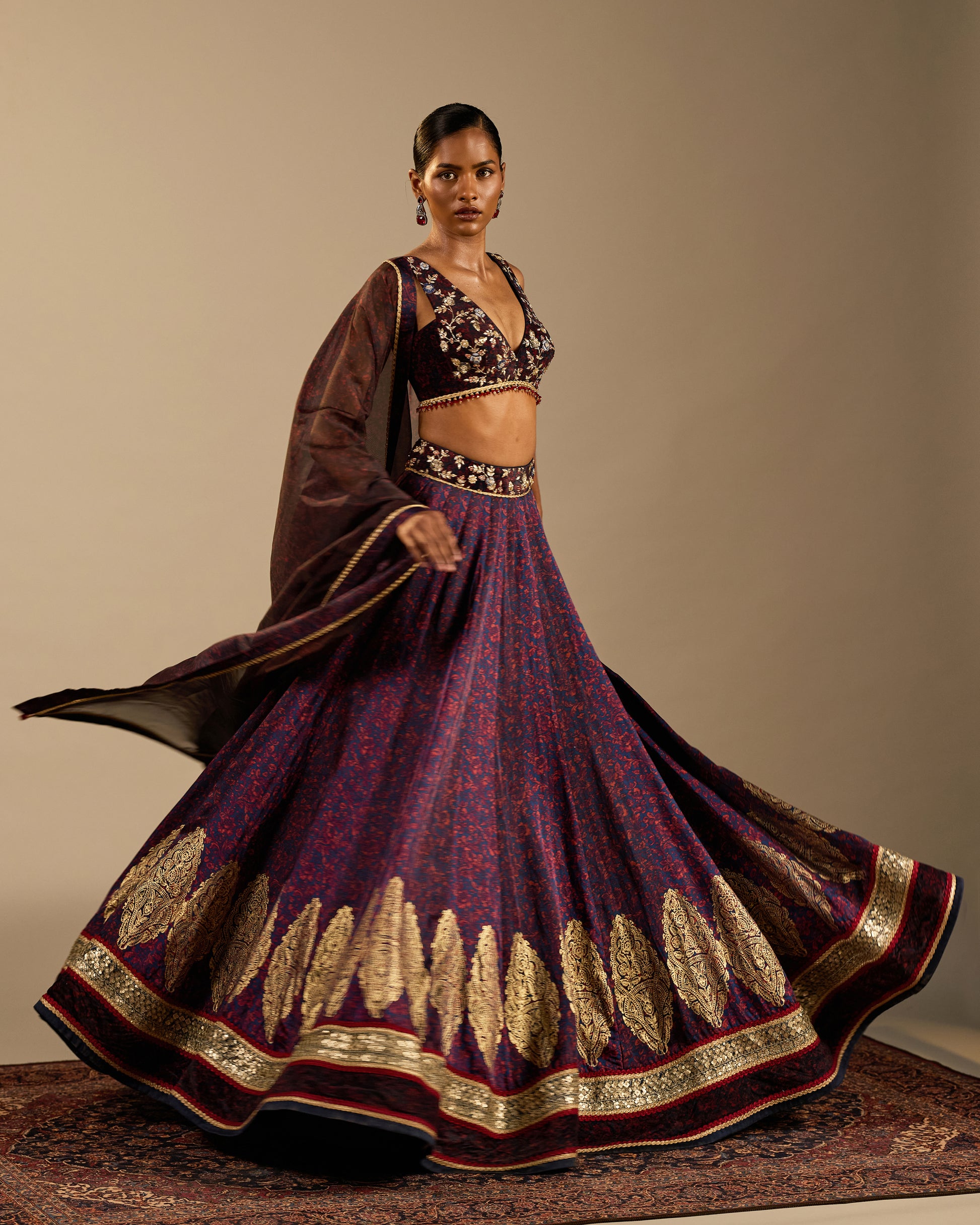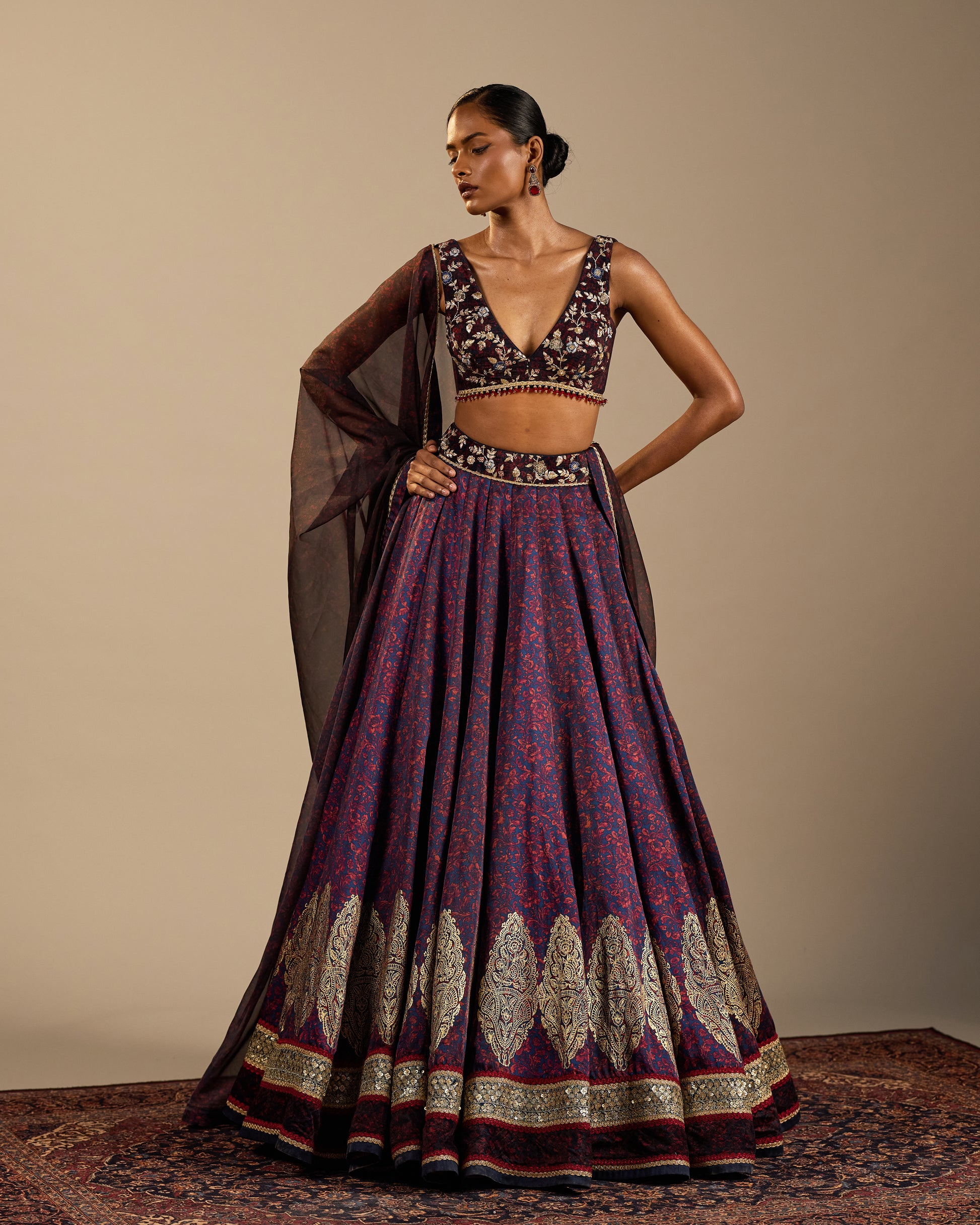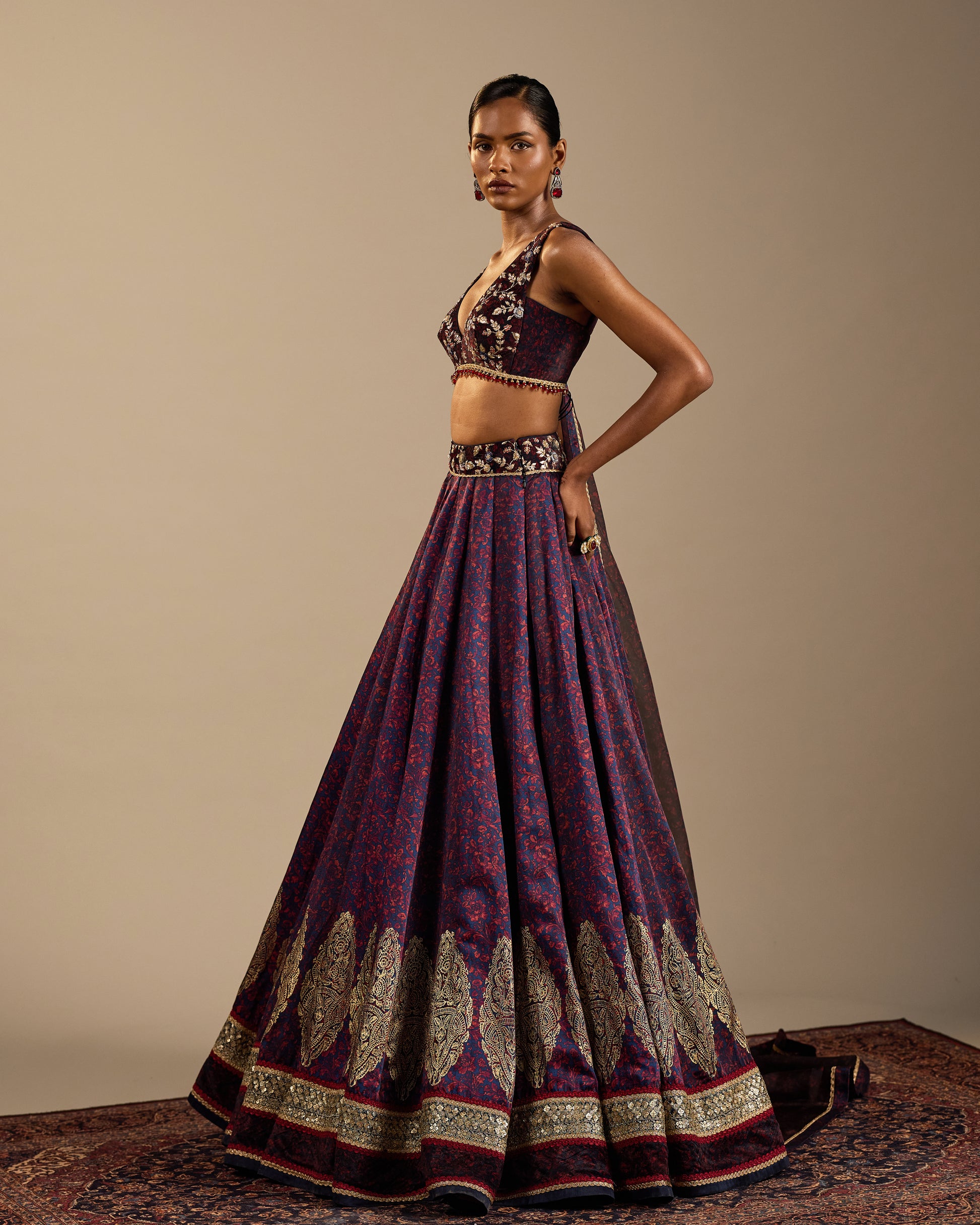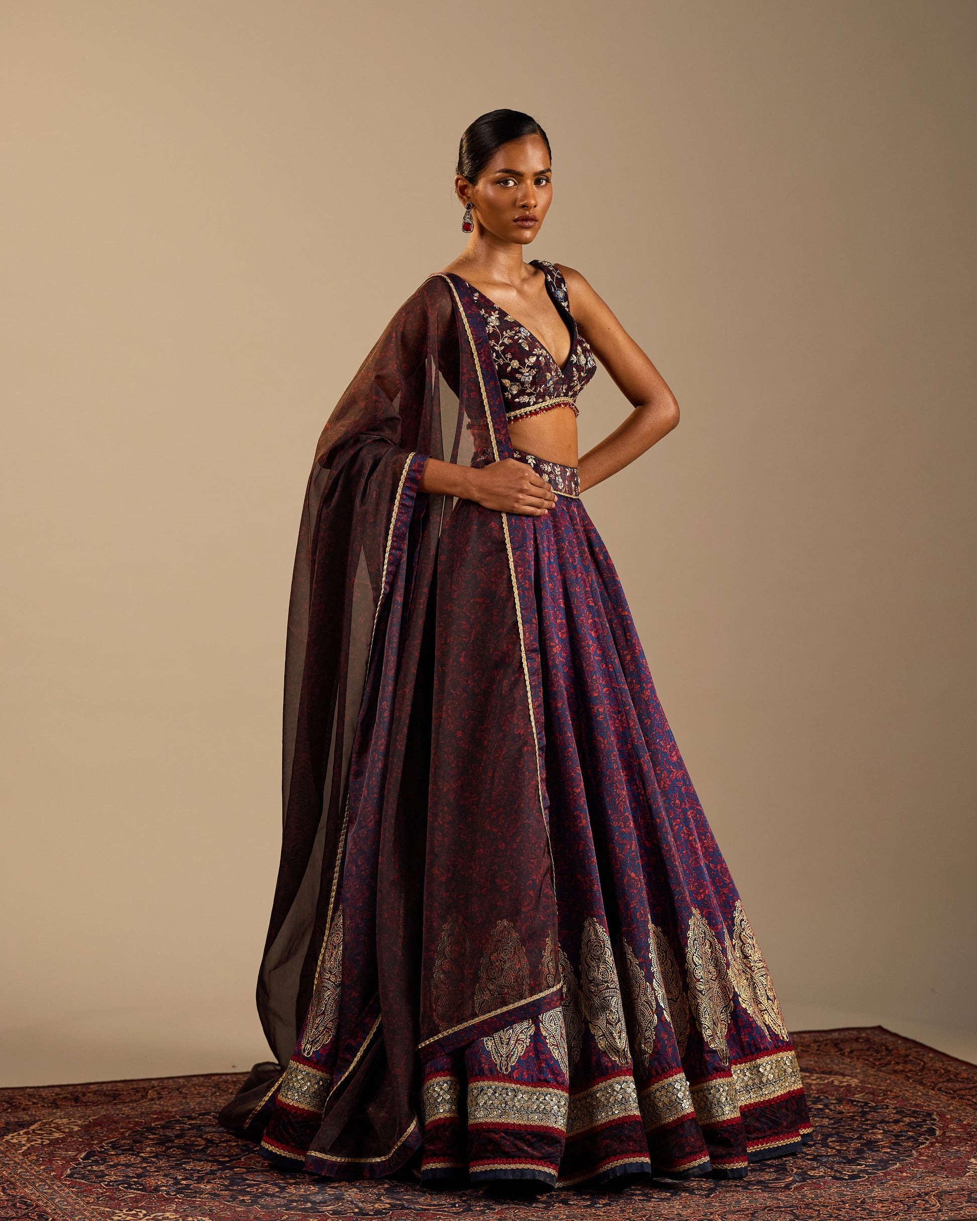 Vintage print lehenga enhanced with hand block printed motifs. It is paired with hand embroidered blouse and printed organza dupatta.